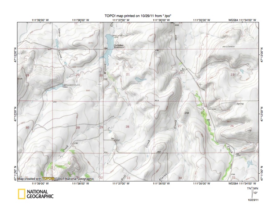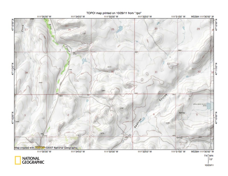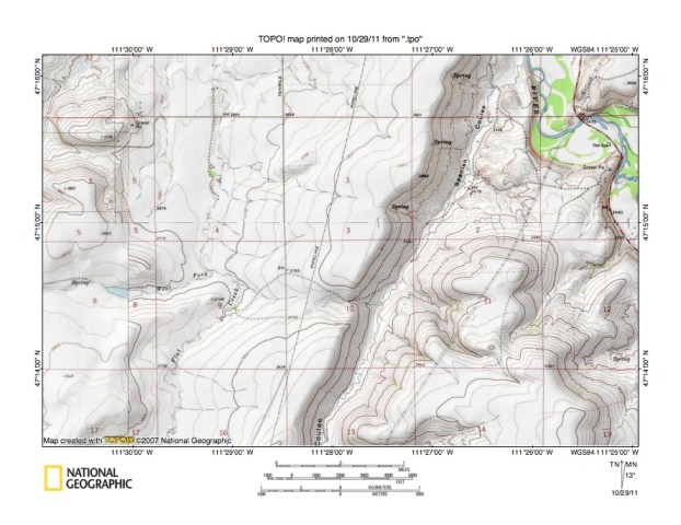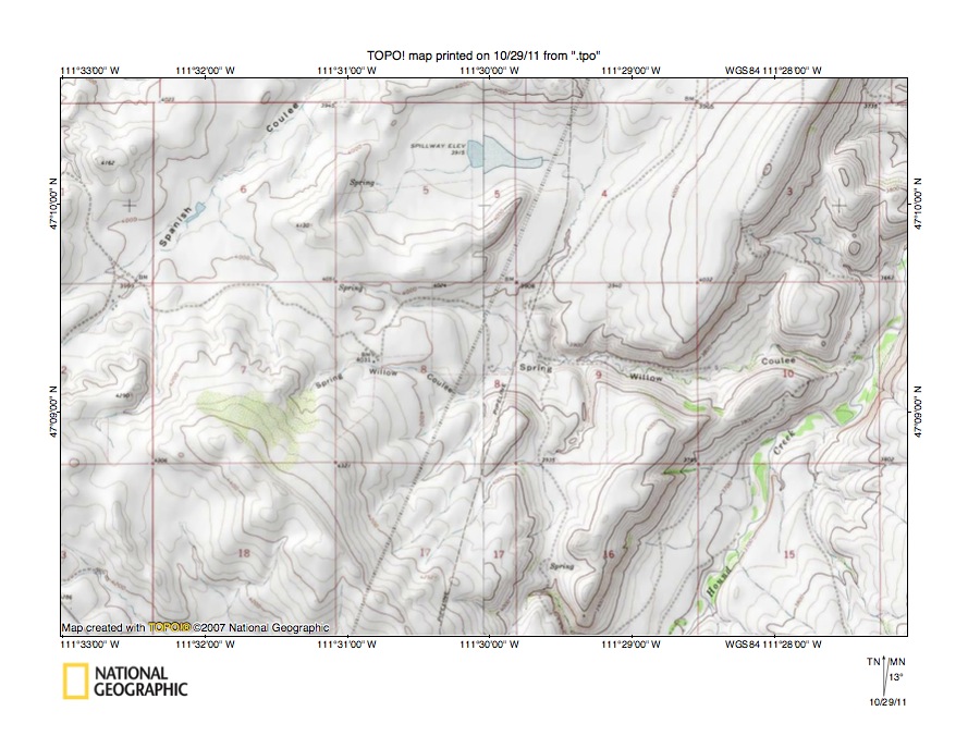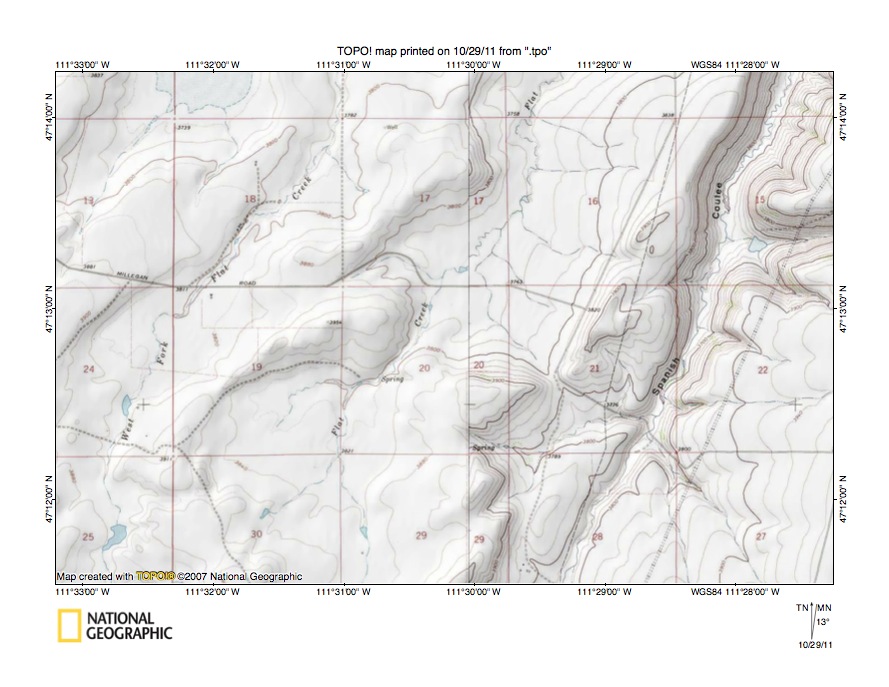Detailed map of Flat Creek-Spanish Coulee (north) drainage divide area