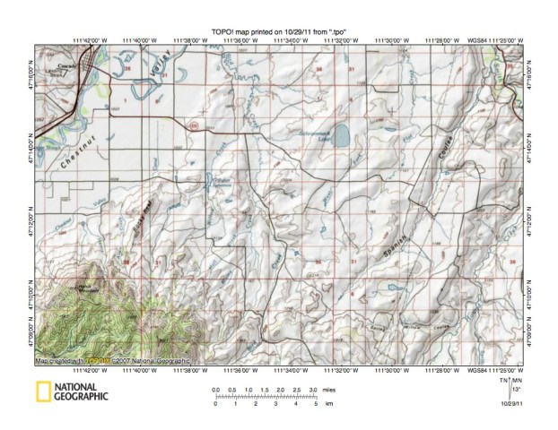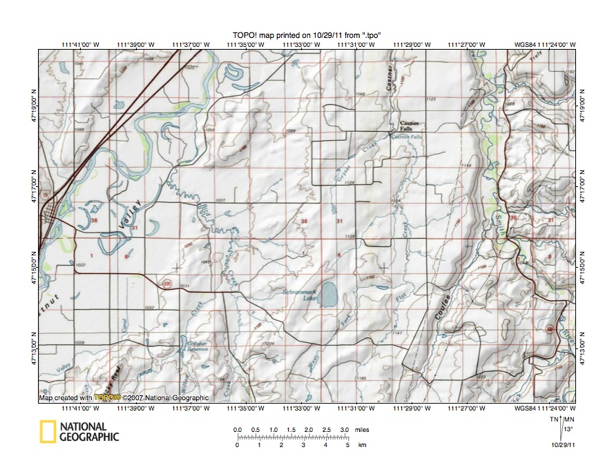 - Figure 6 illustrates the Missouri River-Hound Creek drainage divide area south of the figure 3 map area and includes overlap areas with figure 3. Cascade is the town located near the figure 6 northwest corner. The Missouri River flows in a northeast direction in the large northeast-oriented Chestnut Valley in the region just east and south of Cascade. The Smith River flows in a north-northwest direction in the figure 6 northeast corner. Hound Creek is the north and north-northeast oriented stream flowing from the figure 6 south edge (just west of southeast corner) to the figure 6 east center edge and joins the Smith River east of the figure 6 map area. Spanish Coulee drains in a north-northeast direction to join the Smith River near the figure 6 northeast corner. Bird Creek is located east of Spanish Coulee and flows in a north direction (with some jogs) from the figure 6 south center edge area to the figure 6 north edge (west of center) and joins the Missouri River north of the figure 6 map area. Willow Creek is a northeast, north, and north-northeast oriented Bird Creek tributary located east of Rocky Reef and west of Bird Creek. Other than along its north edge the mountainous region in the figure 6 southwest quadrant is not drained by north-oriented Bird Creek or its north-oriented tributaries. The figure 6 map contour interval is 50 meters and many topography details are lost with this large contour interval. However a close look at the figure 6 map reveals shallow through valleys linking the north-oriented Bird Creek valley with the north-northeast oriented Spanish Coulee valley and also linking the Spanish Coulee valley with the north-oriented Hound Creek valley. Spring Willow Coulee in the figure 6 southeast quadrant is located in the east end of a through valley linking the Spanish Coulee valley with the Hound Creek valley. These through valleys are relics of south-oriented flood flow channels that once crossed the region. Probably the mountainous region in the figure 6 southwest quadrant was being uplifted as flood waters flowed across the region and deep flood water erosion significantly lowered regional elevations both prior to Missouri River valley headward erosion and after the massive flood flow reversals caused by headward erosion of the much deeper Missouri River valley. Figures 7, 8, 9, and 10 below use detailed topographic maps to better illustrate linkages between the present day north-oriented valleys, which were eroded by south-oriented flood flow just prior to the flood flow reversals that eroded the north-oriented valleys.