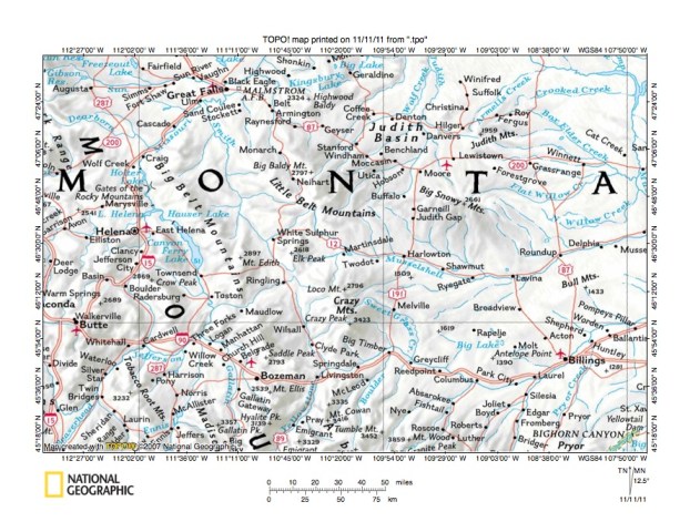 Figure 1: Montana Smith River drainage basin location map (select and click on maps to enlarge). National Geographic Society map digitally presented using National Geographic Society TOPO software.