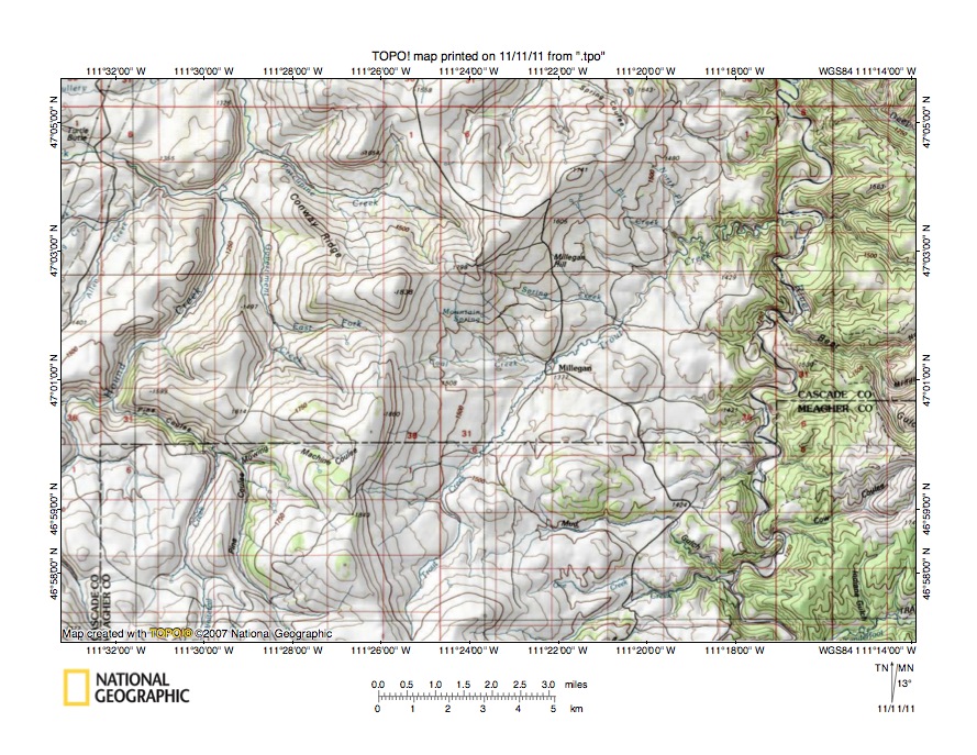 - Looking now at some examples of the topographic map evidence for the initial south oriented flood flow in what is today a north oriented drainage basin figure 2 illustrates the Hound Creek-Smith River drainage divide area north of the Big Belt Mountains. The Smith River meanders in a north direction near the figure 2 east edge. Trout Creek is the north and northeast-oriented tributary flowing from the figure 2 south center edge through the small town of Millegan to join the Smith River in the figure 2 northeast quadrant. Mud Gulch is an east and southeast-oriented Smith River tributary in the figure 2 southeast quadrant. Note how the north and northeast-oriented Trout Creek valley is linked by through valleys with the Mud Gulch valley. The figure 2 map contour interval is 50 meters and some of the through valleys are defined by four or more contour lines on either side indicating depths of more than 200 meters. The through valley are water eroded features and were eroded by southeast-oriented flood flow moving to what was at one time a south oriented flood flow channel on the Smith River alignment. At that time the northeast-oriented Trout Creek valley did not exist. Headward erosion of the northeast-oriented Trout Creek valley beheaded southeast and east oriented flood flow routes to the east and southeast-oriented Mud Gulch valley. Hound Creek flows in a north-northeast and north direction from the figure 2 west edge (just south of center) to the figure 2 north edge (west half). Pine Coulee is the northwest, north, and west-northwest oriented Hound Creek tributary in the figure 2 southwest quadrant. North of Pine Coulee is northwest and north oriented Government Creek, which flows to Hound Creek west of Conway Ridge. West-northwest oriented Porcupine Creek is a Hound Creek tributary located north of Conway Ridge. Note how Porcupine Creek headwaters are linked by a through valley (or pass) with the northeast-oriented Trout Creek valley. The through valley is today a notch in an otherwise high ridge, but is a water eroded feature and is evidence of a southeast-oriented flood flow channel that crossed the region prior to headward erosion of the deep Hound Creek valley. An even deeper through valley can be seen linking the west-oriented East Fork Government Creek valley with the east-oriented Coal Creek valley, which drains to the northeast-oriented Trout Creek valley at Millegan. Still another through valley links the northwest-oriented Pine Coulee headwaters valley with the north- and northeast-oriented Trout Creek headwaters valley (near figure 2 south edge). These through valleys and other similar through valleys were eroded by south and southeast-oriented flood flow that was captured by headward erosion of the north- and northeast-oriented Trout Creek valley when flood flow in what had been the south oriented Smith River flood flow channel was beheaded and reversed north of the figure 2 map area by headward erosion of the much deeper northeast-oriented Missouri River valley. Because headward erosion of the deep Missouri River valley beheaded and reversed south- and southeast-oriented flood flow channels in sequence from east to west flood waters west and south of the actively eroding Missouri River valley head were still moving in south directions after flood waters in the newly beheaded Smith River flood flow channel began to reverse their flow direction.