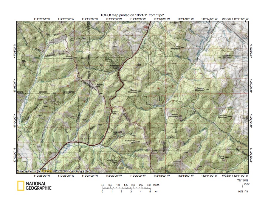 - Figure 3 illustrates another example of topographic map evidence this time in the Middle Fork Dearborn River-Blackfoot River drainage divide area south and east of the figure 2 map area. The east-west continental divide is again marked with a dashed line and is labeled in the figure 3 center region and extends in south-southeast direction from the figure 3 north edge (west half) to the figure 3 south center edge. Highway 200 is the red highway extending from the figure 3 south edge (west half) to the figure 3 north edge (just east of center) and crosses the continental divide at Rogers Pass. The north-northeast oriented stream following highway 200 from Rogers Pass to the figure 3 north edge is the Middle Fork Dearborn River, which joins the Dearborn River north of the figure 3 map area. The north and north-northeast oriented stream originating just east of continental divide and north of the figure 3 south edge and flowing to the figure 3 north edge (east half) is the South Fork Dearborn River. The south-southwest oriented stream following highway 200 south of Rogers Pass is Pass Creek, which joins the west and southwest-oriented Blackfoot River, which then flows to the figure 3 south edge (west half). The south-southeast oriented Blackfoot River tributary flowing across the figure 3 southwest corner is Landers Fork and the south-southwest oriented Landers Fork tributary flowing from the Alice Creek Basin (near figure 3 northwest corner) is Alice Creek.