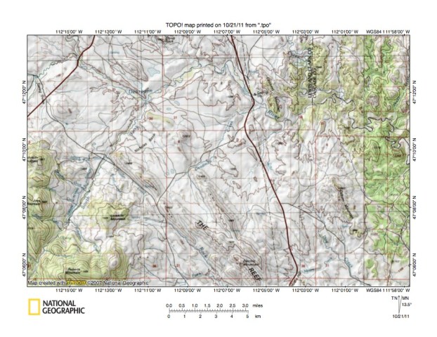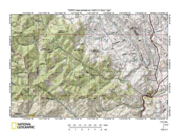 - Moving north and east from the figure 3 map area figure 4 illustrates the Deadman Creek-Dog Creek drainage divide area and includes an overlap area with figure 3 (the southwest corner of figure 4 and northeast corner of figure 3 overlap). The north-northeast oriented Middle Fork Dearborn River joins the southeast-oriented Dearborn River near the figure 4 northwest corner and the Dearborn River continues to flow in a southeast direction until it is joined by the north-northeast oriented South Fork Dearborn River, at which point the Dearborn River turns to flow in a northeast direction before turning again near the figure 4 north center to meander in an east-southeast direction to the figure 4 east edge (north half) and then flow to the north-northeast oriented Missouri River (east of the figure 4 map area). The north-northeast oriented South Fork Dearborn River flows from the figure 4 southwest corner to join the Dearborn River. Note north of Limekiln Mountain (in figure 4 southwest quadrant) northwest-oriented Pruden Creek, which flows to the north-northeast oriented South Fork Dearborn River. Northwest-oriented Pruden Creek is linked by a northwest-southeast oriented through valley with southeast-oriented Rock Creek, which flows to the figure 4 south center edge and then to the Missouri River. Rock Creek flows along the southwest edge of The Reef, which appears to be a plunging anticline, and the through valley is probably related to the underlying geologic structure. However, the through valley is a water eroded feature and was eroded by southeast-oriented flood flow prior to headward erosion of the deep north-northeast-oriented South Fork Dearborn River valley, which beheaded the southeast-oriented flood flow. Flood waters on the northwest end of the beheaded flood flow channel reversed flow direction to erode the northwest-oriented Pruden Creek valley.