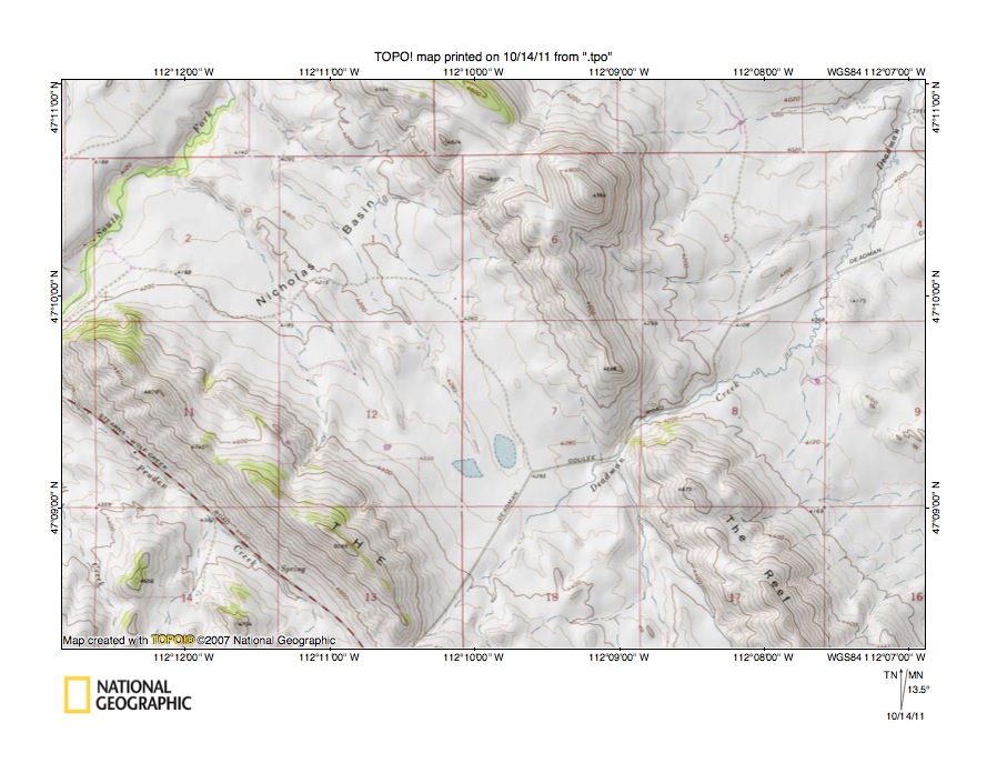 - Figure 5 illustrates a detailed topographic map of the South Fork Dearborn River-Deadman Creek drainage divide area seen in less detail in figure 3 above. The South Fork Dearborn River flows in a northeast direction across the figure 5 northwest corner. Deadman Creek originates near the figure 5 south center edge and flows in a northeast and north-northeast direction to the figure 5 northeast corner. As seen in figure 3 Deadman Creek is a Dearborn River tributary. Note how Deadman Creek has eroded a deep water gap across the northeast arm of the Reef, which suggests initially Deadman Creek flowed on an erosional surface as high as the top of the Reef today. The Nicholas Basin is labeled and is mostly drained by northwest-oriented South Fork Dearborn River tributaries, although one southeast-oriented Deadman Creek tributary is also shown. The figure 5 contour interval is 40 feet and the South Fork Dearborn River-Deadman Creek drainage divide in the Nicholas Basin has an elevation of between 4280 and 4320 feet. Elevations on the southwest arm of the Reef rise to 6085 feet, although most elevations are lower. Elevations on the northeast arm of the Reef seen in figure 5 are less than 5000 feet with 4953 feet being the high point, although as seen in figure 4 elevations south of figure 5 rise to 5247 feet. These elevations suggest the Nicholas Basin through valley records approximately 700 feet of erosion, if not more. The figure 5 drainage history can be described as beginning with massive southeast-oriented flood flow moving across the entire figure 5 map area on an erosional surface at least as high as the highest figure 5 ridges today (and possibly as high or higher than the highest figure 5 elevations today). Flood waters were probably moving to what was then the actively eroding and deep north-northeast oriented Missouri River valley. Headward erosion of the deep northeast-oriented Deadman Creek valley (from the what was then the actively eroding and deep Dearborn River valley, which was eroding headward from the newly eroded Missouri River valley) captured the southeast-oriented flood flow. Flood waters on the northwest end of the beheaded flood flow routes reversed flow direction to erode what is today the northwest-oriented Deadman River tributary valley between the southwest and northeast arms of the Reef. This deep erosion was probably aided by captured flood flow from southeast-oriented flood flow routes located west of the Deadman Creek valley head. Next headward erosion of the deep northeast-oriented South Fork Dearborn River valley beheaded the southeast-oriented flood flow to the newly eroded Deadman Creek valley. Flood waters on northwest ends of the beheaded flood flow routes reversed flow direction to erode the Nicholas Basin and the northwest-oriented South Fork Dearborn River tributary valleys. Again yet to be beheaded flood waters from west of the actively eroding South Fork Dearborn River valley head probably were captured (west of figure 5) and aided in the deep erosion of the Nicholas Basin.