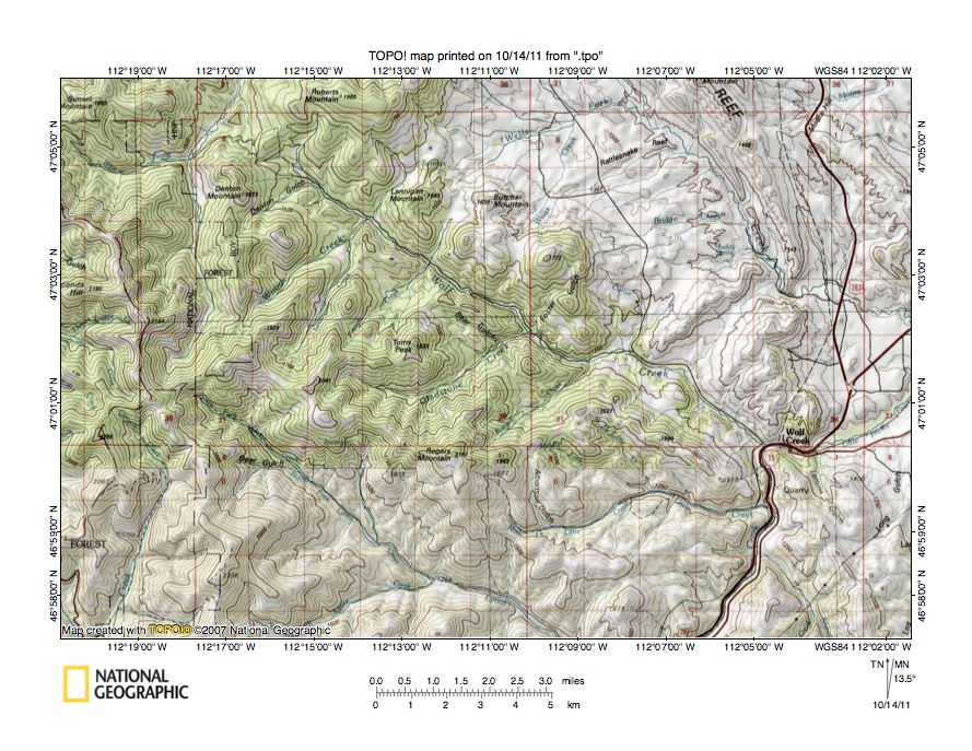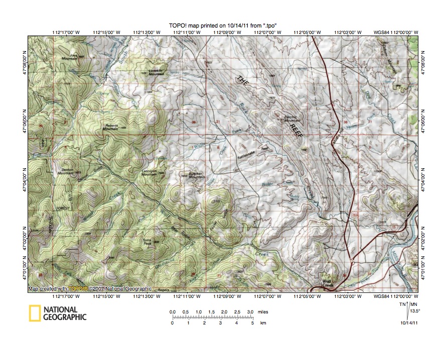 - Figure 6 illustrates the Rock Creek-Wolf Creek drainage divide area south and west of the figure 3 map area and includes overlap areas with figure 3. The Missouri River flows in a north direction in the figure 6 southeast corner. The northeast-oriented stream joining the Missouri River in the figure 6 southeast corner is Little Prickly Pear Creek and the southeast oriented stream joining Little Prickly Pear Creek at the town of Wolf Creek (near figure 6 south edge) is Wolf Creek. Wolf Creek originates in the figure 6 west center south of Roberts Mountain and flows in a southeast direction to join Little Prickly Pear Creek at the town of Wolf Creek. The north and north-northeast oriented stream west of the Wolf Creek headwaters is the South Fork Dearborn River, which originates near the figure 6 southwest corner. The southeast oriented stream originating in the figure 6 southwest corner, just east and south of the South Fork Dearborn River headwaters, is the North Fork Lyons Creek, which flows to southeast-oriented Lyons Creek, which in turn flows to north-northeast oriented Little Prickly Pear Creek. Roberts Creek is the northwest-oriented South Dearborn River tributary located between Roberts Mountain and Limekiln Mountain in the figure 6 northwest quadrant. The Reef is labeled and extends in a southeast and south-southeast direction from the figure 6 north center. Rock Creek is the southeast-oriented stream originating near Roberts Mountain and flowing along the southwest margin of the Reef to join the north-oriented Missouri River downstream from where Little Prickly Pear Creek joins the Missouri River. Coburn Mountain is labeled and is located in the figure 6 northeast corner. Southeast-oriented Dog Creek flows between Coburn Mountain and the Reef. Note how the Rock Creek headwaters are linked by a deep east-oriented through valley (south of Limekiln Mountain) with the northwest-oriented Roberts Creek valley. This through valley was eroded by southeast- and east-oriented flood flow moving to what was then the actively eroding southeast-oriented Rock Creek valley prior to headward erosion of the deep north-northeast oriented South Dearborn River valley. This flood flow route illustrates how yet to be beheaded flood flow west of an actively eroding valley head could be captured and diverted to a previously beheaded flood flow channel (in this case the southeast-oriented Rock Creek valley) or to a beheaded and reversed flood flow channel (in this case the northwest-oriented Pruden Creek valley just north of figure 6). When South Dearborn River valley headward erosion did behead the southeast- and east-oriented flood flow channel flood waters on the northwest end of the beheaded flood flow channel reversed flow direction to erode the northwest-oriented Roberts Creek valley. North and east of Limekiln Mountain a northwest-southeast oriented through valley links the northwest-oriented Pruden Creek valley (north of figure 6) with the southeast-oriented Rock Creek valley and provides evidence of converging flood flow channels.