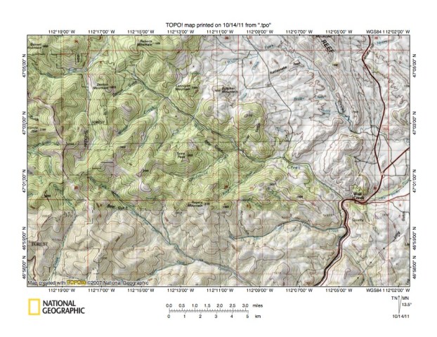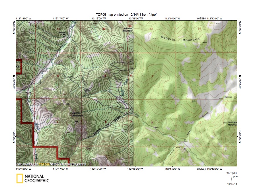 - Figure 7 provides a detailed topographic map of the Roberts Creek-Rock Creek drainage divide area seen in less detail in figure 6 above. The South Fork Dearborn River flows in a north-northeast direction from the figure 7 west edge (south of center) to the figure 7 north edge (west half). Roberts Creek originates in section 27 south of Limekiln Mountain and flows in a northwest direction to join the South Fork Dearborn River in the section 21 southwest quadrant. Rock Creek flows in an east-northeast and east direction across the section 23 and 24 south halves to the figure 7 east edge (north half) and then turns to flow in a southeast direction as seen in figure 6. The highway in the figure 7 northeast corner is located in the northwest-southeast oriented through valley linking the northwest-oriented Pruden Creek valley (north of figure 7) with the southeast oriented Rock Creek valley (east of figure 7). Note in the section 27 northeast quadrant (south of Limekiln Mountain) a southwest-northeast oriented through valley linking the Roberts Creek headwaters valley with the Rock Creek headwaters valley. The figure 7 map contour interval is 40 feet and the through valley floor elevation at the drainage divide appears to be between 5000 and 5040 feet (the contour lines are very faint in that area so it might be higher). Limekiln Mountain to the north rises to 5375 feet while Roberts Mountain just south of the figure 7 south edge rises to 6431 feet. Depending on which elevations are chosen the Roberts Creek-Rock Creek through valley is at least 300 feet. The Roberts Creek-Rock Creek through valley was eroded by southeast- and east-oriented flood flow from west of what was then the actively eroding north-northeast oriented and deep South Fork Dearborn River valley head. The flood flow had been captured by headward erosion of the deep southeast-oriented Rock Creek valley east of the figure 7 map area. Headward erosion of the deep north-northeast oriented South Fork Dearborn River valley beheaded southeast-oriented flood flow to the actively eroding Rock Creek valley and flood waters on the northwest end of the beheaded flood flow channel reversed flow direction to erode the northwest-oriented Pruden Creek valley. However, flood waters from further west were still able to reach the beheaded southeast-oriented Rock Creek valley by flowing south of Limekiln Mountain on the Roberts Creek-Rock Creek through valley route and eroded a deep flood flow channel there. Continued headward erosion of the deeper South Fork Dearborn River valley next beheaded the Roberts Creek-Rock Creek flood flow channel with flood waters on the northwest end of the beheaded flood flow channel reversing flow direction to erode the northwest-oriented Roberts Creek valley.