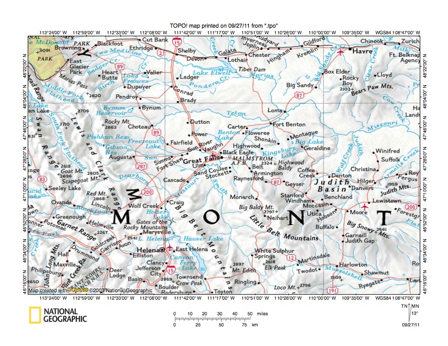 - Figure 1 illustrates a location map for the Sun River-Dearborn River drainage divide area in Lewis and Clark County, Montana and shows a region in north central Montana. The Canadian border is a short distance north of the figure 1 north edge. The southeast end of Glacier National Park is located in the figure 1 northwest corner. Great Falls is the largest city shown and is located near the figure 1 center. The Missouri River flows in a north-northwest direction from the figure 1 south center edge through Canyon Ferry Lake to Wolf Creek where it turns to flow in a northeast direction to Great Falls, Fort Benton, and Loma. South of Big Sandy the Missouri River abruptly turns to flow in a south-southeast and then east direction to the figure 1 east edge with water eventually reaching the Gulf of Mexico. The east-west continental divide extends in a south-southeast direction from the figure 1 northwest corner through Marias Pass (at south end of Glacier National Park) and then along or near the Lewis and Clark Range crest to the figure 1 south edge (west of Helena). The Sun River originates along the continental divide (south of Marias Pass) and flows in a south-southeast and east direction to join the Missouri River at Great Falls. The Dearborn River is located south of the Sun River and also originates along the continental divide in the Lewis and Clark Range and flows in an east and southeast direction to join the northeast-oriented Missouri River near Craig. North of the Sun River is the east-oriented Teton River, which also originates along the continental divide, and which joins the Missouri River near Loma. North of the Teton River is the east- and south-oriented Marias River, tributaries of which originate along the continental divide, and which joins the Teton River to join the Missouri River near Loma. West of the continental divide in the figure 1 southwest corner is north- and northwest-oriented Clark Fork, which flows through Deer Lodge and Drummond, with water eventually reaching the Columbia River and the Pacific Ocean. The west-oriented Blackfoot River is a Clark Fork tributary and the northwest and north-northwest oriented Middle Fork and South Fork Flathead River flow to the south-oriented Flathead River (west of the figure 1 map area), which is also a Clark Fork tributary. Note also the north-northwest oriented Missouri River headwaters valley and tributaries to the northeast-oriented Missouri River segment (including the north-northwest oriented Smith River). The Sun River-Dearborn River drainage divide area in eastern Lewis and Clark County investigated in this essay is located east of the Lewis and Clark Range, north and west of the Missouri River, and south of the Sun River. Essays describing other Dearborn and Sun River drainage basin drainage divide areas can be found by selecting the Dearborn River or Sun River categories from the sidebar category list.