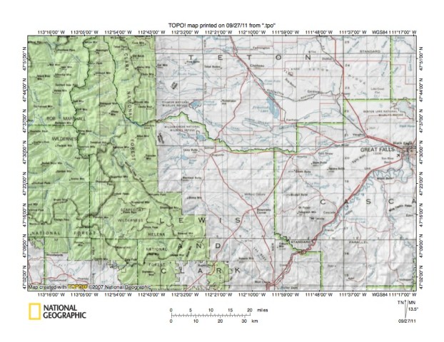 Detailed map of Flat Creek-Dearborn River drainage divide area