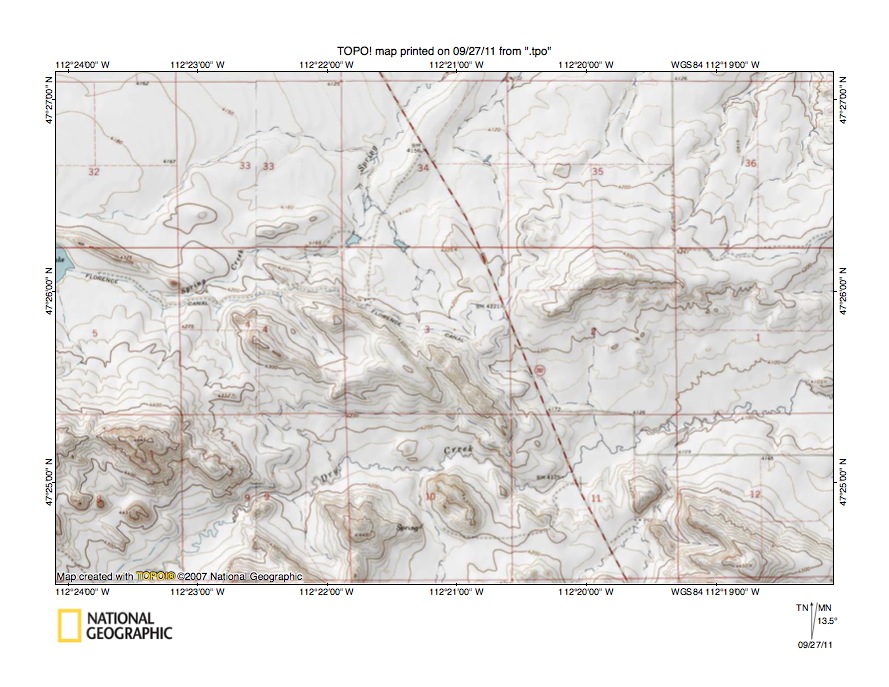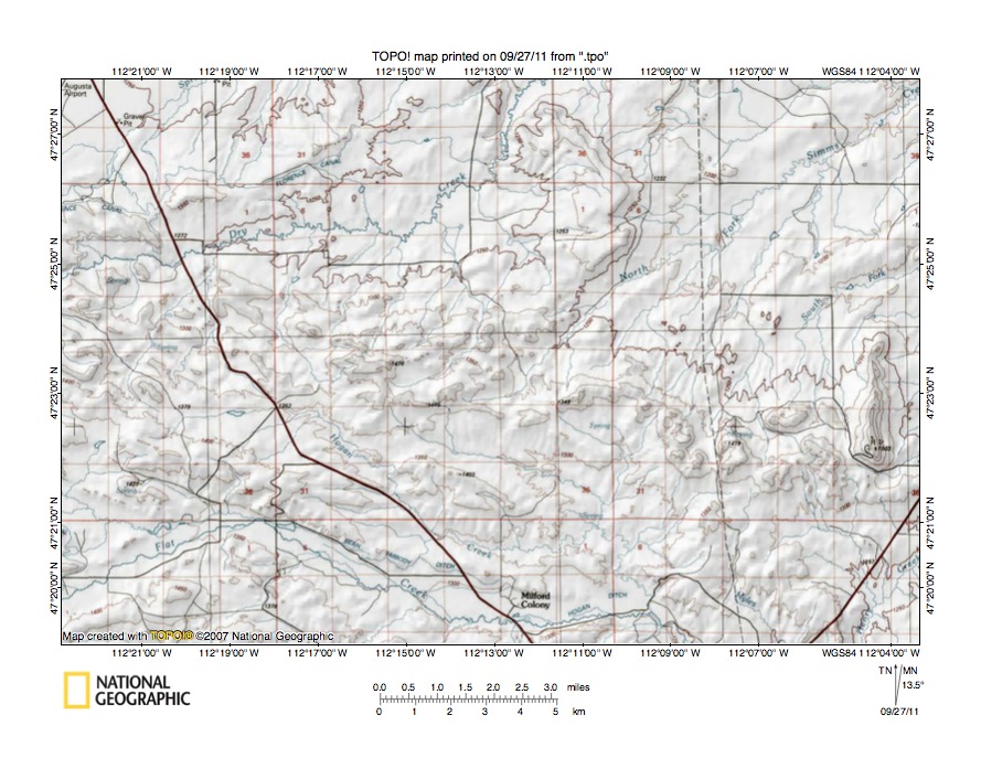 - Figure 4 provides a detailed a topographic map of the South Fork Simms Creek-Flat Creek drainage divide area seen in less detail in figure 3 above. The north-south oriented Lewis and Clark-Cascade County boundary is labeled and can be seen in the figure 4 east half. Milford Colony is located just west of the figure 4 southwest corner. Flat Creek flows in an east and southeast direction in the figure 4 southwest corner region. Hogan Creek is the southeast-oriented tributary flowing from the figure 4 west center edge to join Flat Creek near the figure 4 southwest corner. Myles Creek is a south-oriented stream originating in section 33 and flowing to the figure 4 south edge (just west of center) and joining Flat Creek just south of the figure 4 map area. Henry Creek is an east and south-oriented stream originating just east of the Myles Creek headwaters in the section 33 southeast corner and flowing to the figure 4 south edge (east of center) and joining Flat Creek south of the figure 4 map area. Headwaters of the northeast-oriented South Fork Simms Creek can be seen near the figure 4 north center edge. The North Fork Simms Creek is located immediately to the west and north of the South Fork Simms Creek. Numerous north-south oriented through valleys can be seen linking the north-oriented Simms Creek tributary valleys with the south-oriented Flat Creek tributary valleys. The deepest through valley is located in section 1 just west of the county line and links a north-oriented South Fork Simms Creek tributary valley with the south-oriented Henry Creek valley. The figure 4 contour interval is 20 feet and the through valley floor elevation at the drainage divide is between 4080 and 4100 feet. The high point in section 26 to the west is shown as being 4932 feet and while not seen in figure 4 the high point on Rocky Butte just east of figure 4 is shown as being 4702 feet. In other words the through valley is 500-740 feet lower than the adjacent high points. This deep north-south oriented through valley was eroded as a south-oriented flood flow channel prior to being beheaded by headward erosion of the northeast-oriented South Fork Simms Creek valley. In the section 26, 27, 28, 29, 32, 33, 34, and 35 area there are multiple north-south oriented through valleys linking the south-oriented Flat Creek tributary valleys with north-oriented North and South Forks Simms Creek valleys, although floor elevations of these through valleys are several hundred feet higher than the floor of the section 1 through valley. These higher elevation through valleys were also eroded as south-oriented flow channels located west of the deeper section 1 through valley and suggest flood waters may have been flowing on higher level surfaces in the west than in the east. Again headward erosion of the northeast-oriented South Fork Simms Creek valley and subsequent headward erosion of the northeast-oriented North Fork Simms Creek valley beheaded south-oriented flood flow channels and flood waters on north ends of beheaded flood flow channels reversed flow direction to create the drainage divide.