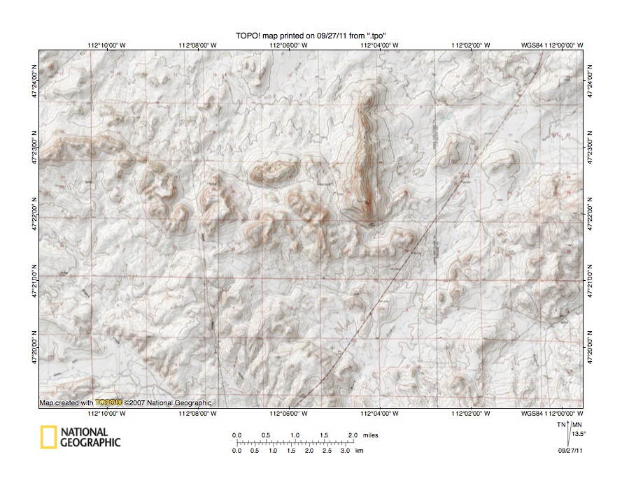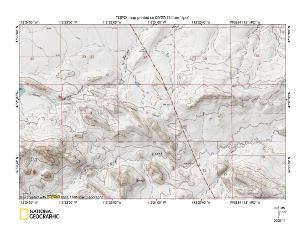 - Figure 5 illustrates the Dry Creek-Flat Creek drainage divide area located west of the figure 3 map area and includes overlap areas with figure 3. Smith Creek is the east-northeast oriented stream located near the north edge of the figure 5 northwest quadrant. Elk Creek is the north-northeast oriented tributary flowing from the figure 5 west edge (near southwest corner) to join Smith Creek near the figure 5 north edge. North of the figure 5 map area Smith Creek joins the Sun River. Flat Creek originates east of the Harrison Basin Ridge in the figure 5 southwest quadrant (just north of the south edge) and flows in an east-northeast and east-southeast direction to the figure 5 east edge (just north of southeast corner). Clemons Creek is the east-northeast and southeast oriented stream south of the Harrison Basin Ridge and flows to the Dearborn River just south of the figure 5 map area. Hay Coulee is a northwest-oriented Elk Creek tributary in the figure 5 southwest quadrant located between Harrison Basin Ridge and Connors Reef. Note how the northwest-oriented Hay Coulee valley is linked by a through valley with the east-oriented Flat Creek valley and also with the southeast-oriented Clemons Creek valley. These through valleys were eroded by diverging south and east-oriented flood flow channels to both the actively eroding Flat Creek valley and the Dearborn River valley (south of figure 5). The south-oriented flood flow ended when headward erosion of the Smith Creek valley beheaded the flood flow channel and flood waters on the north end of the beheaded flood flow routes reversed flow direction to erode the north-northeast Elk Creek valley and its northwest-oriented Hay Coulee tributary valley. Dry Creek originates north of Connors Reef and flows in a northeast and east-northeast direction to the figure 5 east edge (south of northeast corner). Note a northwest-oriented Dry Creek tributary near the figure 5 center, which is linked by a through valley with a southeast-oriented Flat Creek tributary. The through valley is defined by one contour line on each side (the contour interval is 50 meters) and provides evidence of southeast-oriented flood flow prior to headward erosion of the northeast-oriented Dry Creek valley. Headward erosion of the Dry Creek valley beheaded the southeast-oriented flood flow channel and flood waters on the northwest end of the beheaded flood flow channel reversed flow direction to erode the northwest-oriented Dry Creek tributary valley. Other northwest-southeast oriented through valleys can be seen, although the 50-meter contour interval does not include enough topography detail to fully show the extent of figure 5 flood eroded channels.