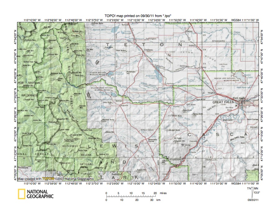 - Figure 2 provides a more detailed location map for the Sun River-Dearborn River drainage divide area in western Lewis and Clark County, Montana. County boundaries are shown and Lewis and Clark County, Cascade County, and Teton County are labeled. Green areas on figure 2 are National Forest lands and are generally located in the mountain regions. The Sun River-Dearborn River drainage divide area of interest in this essay is located in the green shaded region. The Lewis and Clark County western boundary is defined by the east-west continental divide. The Missouri River flows in a northeast direction from the figure 2 south edge (east of center) to Great Falls and the figure 2 east center edge. Note how a northwest arm of Lewis and Clark County is located west of Teton County in the figure 2 northwest quadrant. The North Fork of the Sun River originates at Sun River Pass, which is located at the north tip of the Lewis and Clark County northwest arm and flows in a south direction along the Teton County-Lewis and Clark County border to join the north-oriented South Fork Sun River just west of Gibson Reservoir and to form the east-oriented Sun River, which flows from Gibson Reservoir in more of an east direction along the Teton-Lewis and Clark County boundary until reaching the Cascade County border where it continues in an east direction to join the Missouri River at Great Falls. Important Sun River tributaries from the south (in this essay) include Straight Creek, which flows in a north-northwest direction to join the north-oriented South Fork Sun River; northeast-oriented Smith Creek which originates near Welcome Pass and which joins northeast-oriented Willow Creek which joins the Sun River near Willow Creek Reservoir; and northeast-oriented Elk Creek, which originates north of Steamboat Mountain and which flows through Augusta and Gilman before joining the Sun River. The Dearborn River originates near Scapegoat Mountain and flows in a southeast and northeast direction to near Welcome Pass before turning to flow in a southeast and northeast direction around the south side of Steamboat Mountain and then turning to flow in a southeast direction to join the northeast-oriented Missouri River.