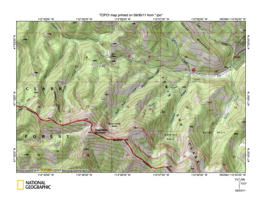 - Figure 9 uses a detailed topographic map to illustrate the Smith Creek-Elk Creek drainage divide at Elk Pass seen in less detail in figure 7 above. Steamboat Mountain is the high peak located along the Sun River-Dearborn River drainage divide which also serves as the Wilderness Boundary. Areas south and west of the well-marked drainage divide drain to the Dearborn River while all other figure 9 map areas drain to the Sun River. Elk Pass is located on the line between sections 8 and 9 north of Steamboat Mountain. Smith Creek originates north of the figure 9 north center edge and flows in a southwest direction to the section 8 northeast corner where it is joined by a northwest-oriented tributary originating at Elk Pass and then flows in a northwest direction to the figure 9 north edge (north of section 7). North of figure 9 Smith Creek turns to flow in a northeast direction to join the east-oriented Sun River. Elk Creek originates in section 17 (north of Steamboat Mountain) and flows in a north and northeast direction to Elk Pass and then turns to flow in an east-southeast and northeast direction to the figure 9 east edge (north half). East and north of figure 9 Elk Creek also flows to the east-oriented Sun River. Elk Pass is a well-defined through valley linking the northwest-oriented Smith Creek valley with the east-southeast oriented Elk Creek valley. The figure 9 map contour interval is 40 feet and the Elk Pass elevation at the drainage divide is between 5960 and 6000 feet. Elevations of approximately 6900 feet can be seen along the figure 9 north edge and elevations greater 7600 feet can be found north of the figure 9 map area. Steamboat Mountain rises to 8685 feet and most elevations along the Sun River-Dearborn River drainage divide in figure 9 exceed 7600 feet. In other words the Elk Pass through valley is probably a 1600 foot or more deep erosional landform eroded by southeast-oriented flood flow which was first captured by headward erosion of the deep northeast-oriented Elk Creek valley. At that time headward erosion of the northeast-oriented Smith Creek valley had not yet beheaded the southeast-oriented flood flow and flood waters were free to flow in a southeast direction into and across the figure 9 map area. These southeast-oriented flood waters moving to the actively eroding Elk Creek valley eroded a deep southeast-oriented flood flow channel and beheaded south-oriented flood flow channels to the actively eroding Dearborn River valley south of figure 9. Flood waters on north ends of the beheaded flood routes reversed flow direction to erode north-oriented tributary valleys and to carve what is today the north side of the Sun River-Dearborn River drainage divide. South of the figure 9 map area the actively eroding southeast-oriented Dearborn River valley captured south-oriented flood flow and eroded the south side of the Sun River-Dearborn River drainage divide until those south-oriented flood flow routes were beheaded and reversed by headward erosion of the deep southeast-oriented Elk Creek flood flow channel. Headward erosion of the deep northeast-oriented Smith Creek valley (north of figure 9) then beheaded the deep southeast-oriented flood flow channel leading to the Elk Creek valley. Flood waters on the northwest end of the beheaded flood flow channel reversed flow direction to erode the northwest-oriented Smith Creek valley segment.