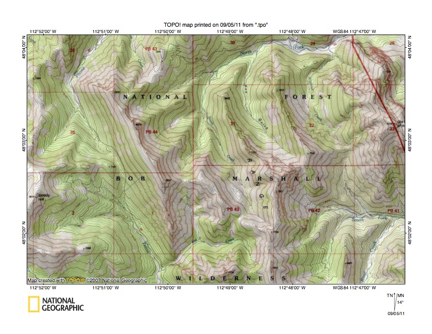 - Figure 10 provides a detailed topographic map of the Phone Creek-Teton River drainage divide area seen in less detail in figure 9 above. Phone Creek originates in section 35 and flows in a north-northwest and north-northeast direction to the figure 10 north edge (west half). North of the figure 10 map area Phone Creek makes several jogs, but generally flows in a north-northwest direction to join the South Fork Birch Creek (see figure 9). South of the Phone Creek headwaters in sections 1 and 2 are Teton River (North Fork) headwaters with the Teton River flowing in a south-southeast direction to the figure 10 south edge (west half). Note the through valley in the southwest corner of the section labeled PB 44 linking the Phone Creek headwaters valley with the Teton River headwaters valley. The figure 10 map contour interval is 40 feet and the through valley floor elevation at the drainage divide is between 6840 and 6880 feet. Elevations on the ridge to the east rise to 8082 feet while Bloody Hill to the west has an elevation of 8074 feet. These elevations suggest the through valley is at least 1200 feet deep. The through valley is actually more complicated and two other higher level channels can also be seen to the west of the deepest channel. These through valleys were eroded by south-southeast oriented flood flow moving to what was then the actively eroding Teton River valley. At that time there was no Birch Creek valley to the north (nor other deep east-oriented valleys further north). Flood water were freely flowing on a surface equivalent to the 8000 mountain tops today in a south-southeast direction across the region and were being captured by headward erosion of the deep east-oriented Teton River valley. Probably at that time the region had not yet been uplifted to reach present day elevations and uplift was probably occurring as flood waters flowed across the region. Headward erosion of the deep northeast-oriented Birch Creek valley subsequently beheaded the south-southeast oriented flood flow routes to the actively eroding Teton River valley. Flood waters on north ends of the beheaded flood flow channels reversed flow direction to erode the north and north-northwest oriented Birch Creek tributary valleys (e.g. Phone Creek valley). The north-northwest oriented stream in the west half of section 31 which turns to flow in an east direction in section 30 is the North Fork Dupuyer Creek. Note how its tributaries from the south also originate as north-northwest oriented streams providing evidence their valleys were eroded by reversals of south-southeast oriented flood flow channels. The north- and east-oriented stream in the figure 10 southeast corner area is the South Fork Dupuyer Creek. Note how in the southeast corner of section 32 a deep thorough valley links the north-northwest oriented headwaters of Washout Creek (flowing to the North Fork Dupuyer Creek) with a south and southeast oriented South Fork Dupuyer Creek tributary valley. The through valley floor elevation at the drainage divide is between 6640 and 6680 feet while mountains on either side rise more than 1200 feet higher, if not more. Many other shallower through valleys can also be found in the figure 10 map area and each through valley provides evidence of a former flood flow channel. Flood water initially flowed on a surface equivalent to the tops of the highest figure 10 mountain peaks and the through valleys, including the deep through valleys, were eroded into that high level surface.
