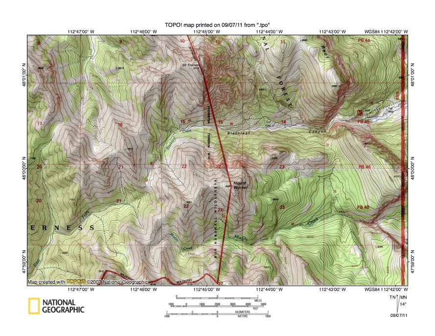 - Figure 8 is a detailed topographic map of the Blacktail Creek-Muddy Creek drainage divide area seen in less detail in figure 7 above. Blacktail Creek originates in the section 22 northwest quadrant and flows in a north-northwest direction into section 15 where it turns to flow in an east direction through Blackleaf Canyon and then to the figure 8 east edge (north half). Muddy Creek originates as a north-northwest oriented stream in the northeast corner of section 28 and then turns to flow in more of an east direction to the figure 8 east edge (south half). The East Fork Teton River flows in a south direction into section 21 and then in a southwest and south-southwest direction to the figure 8 southwest corner. A south-oriented East Fork tributary flows from section 17 to join the East Fork in the section 20 southeast quadrant. The north-oriented stream flowing in the west half of section 9 (figure 8 northwest quadrant) is Rival Creek, which flows to the South Fork Dupuyer Creek. Note how the various present day drainage routes are linked by through valleys crossing all of the drainage divides. Some of the through valleys are deep such as the through valley linking the Blacktail Creek valley with the Muddy Creek valley found in the southwest corner of the region labeled PB 45. The contour interval in the figure 8 northeast quadrant is 20 feet while it is 40 feet elsewhere on the map. The through valley floor elevation at the drainage divide is between 6100 and 6120 feet. The ridge to the east rises to 6753 feet while Mount Werner to the west rises to 8090 feet, which means the through valley is at least 630 feet deep and probably was deeper when eroded. The through valley was eroded by south-oriented flood flow to what was then the actively eroding Muddy Creek valley prior to headward erosion of the deep east-oriented Blacktail Creek valley. Another interesting deep through valley is found in the northeast corner of section 21 and links the north-oriented Blacktail Creek headwaters valley with the southwest-oriented East Fork Teton River valley and the north-oriented East Fork headwaters valley (which is linked by a through valley with the Muddy Creek headwaters valley). This section 21 through valley has a floor elevation at the drainage divide of between 6960 and 7000 feet and Mount Werner to the east rises to 8090 feet while the spot elevation in the section 15 south center region reads 7873 feet. In other words this through valley linking the Blacktail Creek headwaters with the East Fork Teton River headwaters is more than 870 feet deep. These through valleys are just a few examples of through valleys seen on figure 8. Much shallower through valleys appear as saddles between mountain peaks such as the saddles in section 22 along the ridge extending west from Mount Werner. These saddles like the deeper through valleys are water eroded features and are evidence of former south-oriented flood flow routes, which were beheaded by headward erosion of the deeper valleys. The through valleys provide evidence of flood flow channels across this mountainous region which initially flowed on a surface at least as high as the present day mountain tops. Probably the mountains were being uplifted as flood waters flowed across them and eroded the deep valleys seen today.