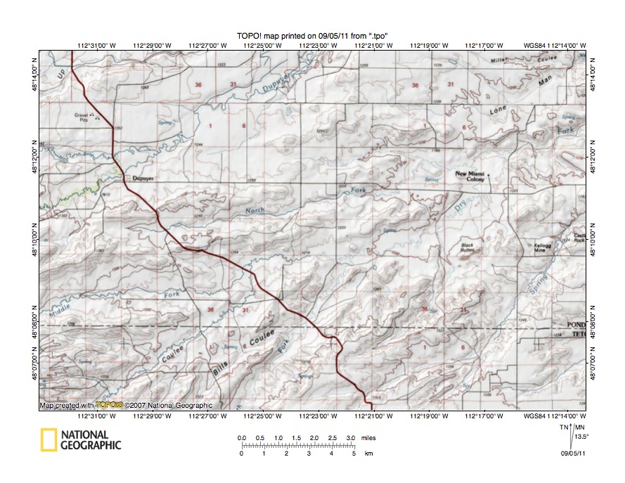 - Figure 6 provides a detailed topographic map of the South Fork Dupuyer Creek-Gansman Coulee drainage divide area seen in less detail in figure 5 above. The South Fork Dupuyer Creek flows in a north-northeast direction from the figure 6 southwest corner to join the north-northeast oriented Middle Fork Dupuyer Creek and east-oriented North Fork Dupuyer Creek near the figure 6 north edge (west half) and then to flow to the figure 6 north edge. The Middle Fork Dry Fork Marias River originates in section 20 and flows in a north-northeast direction to the figure 6 north edge (east of center). Dupuyer Creek and the Dry Fork Marias River eventually reach the Marias River. Gansman Coulee originates in section 30 and drains in an east direction to section 29 and then in a southeast direction to the figure 6 southeast corner. Toms Coulee drains across the section 32 northeast quadrant to the figure 6 edge in section 33. Pings Coulee drains to the figure 6 south center edge in section 32 and Hoy Coulee drains to the figure 6 edge at the line between sections 31 and 32. Gansman Coulee, Toms Coulee, Pings Coulee, and Hoy Coulee as seen in figure 5 all drain eventually to Blacktail Creek, which eventually joins the Teton River. Ben English Coulee originates in section 28 and drains in an east direction to the figure 6 east center edge and eventually to the Middle Fork Dry Fork Marias River. Note how the east-oriented Ben English Coulee valley is linked by a through valley in section 28 to a west- and south-oriented Gansman Coulee tributary valley. Also note how in section 30 the Gansman Coulee valley is linked by two separate through valleys with the north-northeast oriented South Fork Dupuyer Creek valley. These through valley document what were once diverging east and east-southeast oriented flood flow channels moving flood waters to what were then the actively eroding Blacktail Creek and the actively eroding Middle Fork Dry Fork Marias River valleys. A through valley in the southeast quadrant of section 19 links the Middle Fork Dry Fork Marias River valley with the Ben English Coulee, the Gansman Coulee, and the South Fork Dupyer Creek valleys and providing evidence of still additional diverging flood flow channel. These flood flow channels were eroded into a high level surface at least as high as the present day high points in section 21 (5810 feet). Today elevations vary in the figure 6 map area although at the confluence of the North, Middle, and South Forks Dupuyer Creek the elevation is between 4720 and 4740 feet (the map contour interval is 20 feet) suggesting as much as 1000 feet of erosion occurred as flood waters flowed across the region. How much material was stripped from the figure 6 map area before the surface represented by the high point in section 21 was reached cannot be easily determined, although it is possible flood waters stripped significant thicknesses of bedrock material from the entire figure 6 map area before that time.