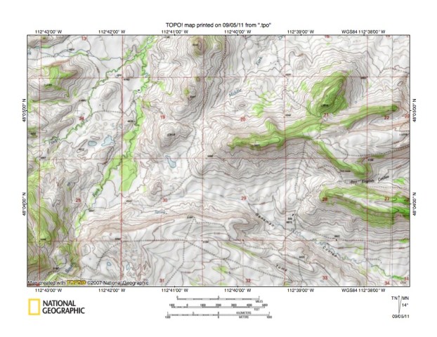 Detailed map of South Fork Dupuyer Creek-Gansman Coulee drainage divide area