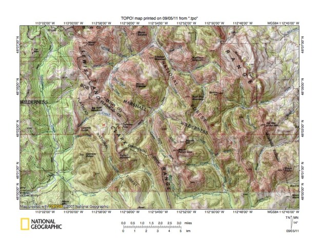 - Figure 9 illustrates the Birch Creek-Teton River drainage divide area west and north of the figure 7 map area and includes an overlap area with figure 7. The east-west continental divide extends in an east and then south-southeast direction from the figure 9 northwest corner along the crest of the Lewis and Clark Range to the figure 9 south center edge. Strawberry Creek is the south-oriented stream originating near the figure 9 northwest corner at Badger Pass (unlabeled in figure 9) and near the figure 9 southwest corner turning to flow in a southwest and west direction to the figure 9 west edge (just north of southwest corner). West of figure 9 Strawberry Creek joins other streams to become the northwest-oriented Middle Fork Flathead River, which eventually flows to the south-oriented Flathead River with water eventually reaching the Pacific Ocean. North of Badger Pass (and not seen in figure 9) are northwest-oriented headwaters of South Badger Creek, with Badger Creek eventually flowing to the Two Medicine River which then flows to the Marias River. Badger Pass is deep north-south oriented through valley crossing the continental divide and provides evidence of a south-oriented flood flow channel which was captured by deep Middle Fork Flathead River valley headward erosion (to form the Strawberry Creek U-turn) and then beheaded and reversed by headward erosion of the Badger Creek valley to erode the northwest-oriented South Badger Creek valley segment. East of the continental divide the Middle Fork Birch Creek originates west of Mount Dewyer (in figure 9 north center area) and flows in a north and northeast direction to the figure 9 north center edge. The South Fork Birch Creek originates near Gateway Pass (on continental divide south of Mount Dewyer) and flows in north-northeast and north-northwest direction (east of Mount Dewyer) to join the Middle Fork Birch Creek near the figure 9 north center edge. Note the north-northwest oriented South Fork Birch Creek tributaries including Crazy Creek, Circus Creek, Lake Creek, and Phone Creek. South of the Phone Creek headwaters are headwaters of the south-southeast oriented North Fork Teton River, which flows to the figure 9 south edge (east half). The East Fork Teton River can be seen in the figure 9 southeast corner. Note how the south-southeast oriented North Fork Teton River headwaters valley is linked by a through valley with the north-northwest oriented Phone Creek valley. The through valley was eroded by south-southeast oriented flood flow which was subsequently beheaded and reversed by headward erosion of the deep northeast-oriented Birch Creek valley. Bruce Creek is a south-southeast and east oriented Teton River tributary originating south of the north-northwest oriented Crazy Creek headwaters. A through valley links the Bruce Creek headwaters valley with the Crazy Creek valley although the through valley floor is much higher than the opposing valley floors on either side. Study of the figure 9 map area reveals many other through valleys crossing the various drainage divides. Some through valleys are deep, but many of the through valleys look more like saddles on high ridges. Each of these through valleys provides evidence of former flood flow routes with the majority of the through valleys suggesting massive south-southeast oriented flood flow across the figure 9 map area.
