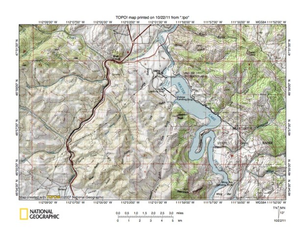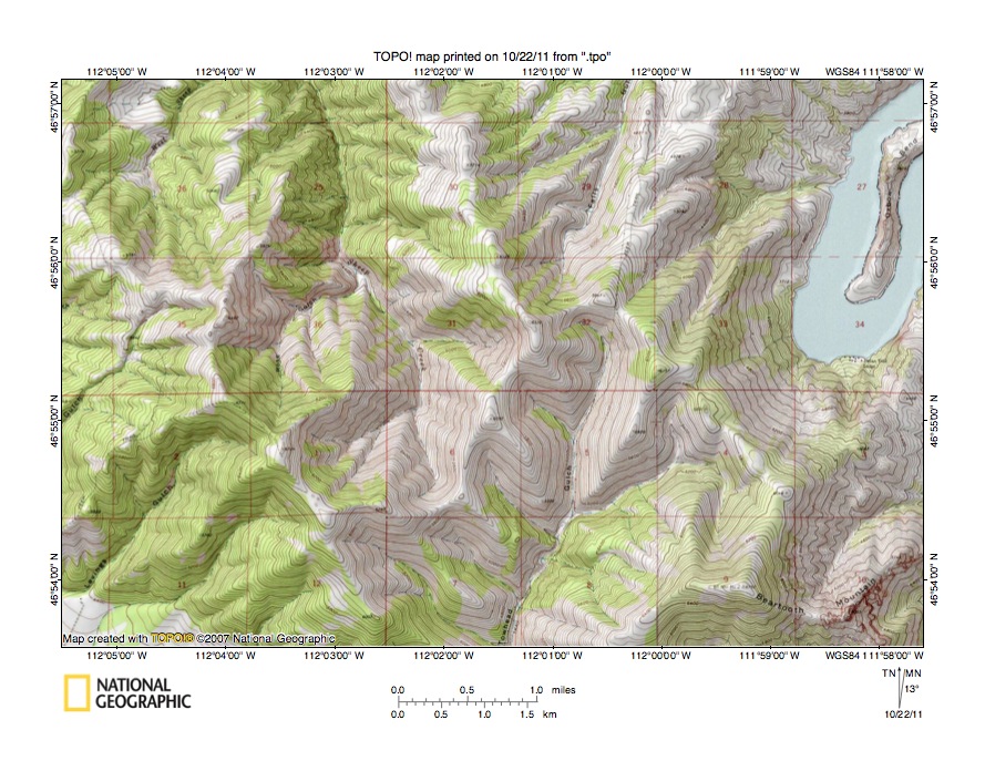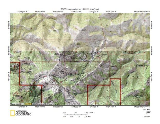Figure 4: Detailed map of Sheep Creek-Towhead Gulch drainage divide area. United States Geological Survey map digitally presented using National Geographic Society TOPO software.