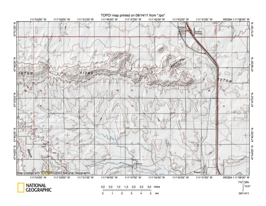 - Figure 3 illustrates the Teton River-Sun River drainage divide area at Teton Ridge. Dutton is the town near the north edge of the figure 3 northeast quadrant and Power is the town along the south edge of the figure 3 southeast quadrant. Cordova is the place-name near the figure 3 south center edge. Teton Ridge is labeled and is a prominent west to east oriented ridge slightly north of the figure 3 center and may be composed of erosion resistant bedrock material, although field inspection is needed to be sure. North-oriented drainage north of Teton Ridge flows to the east-oriented Teton River, which is north of the figure 3 map area. South and southeast-oriented drainage located south of Teton Ridge flows to Muddy Creek, which is the south oriented stream flowing to the figure 3 south edge between Cordova and Power. South of the figure 3 map area Muddy Creek flows in a southeast direction to join the east-oriented Sun River. The Teton River-Sun River drainage divide is remarkably well-defined and is located along the Teton Ridge crest. Note how the Teton Ridge crest is uneven with several well-defined north-south oriented through valleys eroded across it. The largest and deepest of these through valleys is used by the highway and railroad between Dutton and Power in the figure 3 east half, although valley’s eastern wall has been largely eroded away and what remains of the east wall is located east of the figure 3 map area. The figure 3 map contour interval is 20 meters and the through valley floor elevation at the drainage divide is between 1120 and 1140 meters. Teton Ridge elevations just south of Dutton rise to more than 1240 meters while east of the figure 3 map area remnants of Teton Ridge rise to more than 1200 meters. In other words this large north-south oriented through valley is at least 60 meters deep and probably was deeper at one time. Another well-defined north-south oriented through valley eroded across Teton Ridge is seen in the figure 3 west half. The floor of this western through valley at the drainage divide has an elevation of between 1200 and 1220 meters. Teton Ridge on either side of this western through valley rises to more than 1260 meters meaning this through valley is at least 40 meters deep. Other shallower through valleys are located between the two mentioned through valleys. Each of these through valleys is a water eroded landscape feature and was eroded by south-oriented flood flow channels at a time when the east-oriented Teton River valley (north of figure 3) did not exist. At that time south-oriented flood flow was initially flowing on a surface at least as high as the Teton Ridge crest today and was flowing to what was then the newly eroded east-oriented Sun River valley. Flood waters eroded deep south- and southeast-oriented flood flow channels headward from the newly eroded Sun River valley north wall and some of these flood flow channels eroded headward across the present day Teton Ridge location. Headward erosion of the deep Teton River valley subsequently beheaded the south-oriented flood flow channels and flood waters on the north ends of the beheaded flood flow channels reversed flow direction to erode north-oriented Teton River tributary valleys and to erode the north-facing Teton Ridge slope.