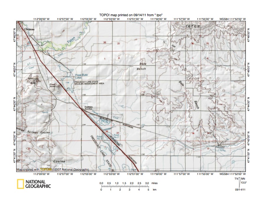 - Figure 5 illustrates the Teton River-Muddy Creek drainage divide area west and slightly south of the figure 3 map area and includes overlap areas with figure 3. Choteau is the town in the figure 5 northwest corner. The Teton River flows in an east direction just south of Choteau and then turns to flow in a northeast direction to the figure 5 north edge (west half). North of the figure 5 map area the Teton River turns to flow in more of an east direction (see figures 1 and 2). Teton Ridge can be seen in the figure 5 northeast corner area and Bole Bench is the upland region to the south in the figure 5 east center region. Between Teton Ridge and Bole Bench is northwest-southeast oriented TL Gap which is a through valley linking the northeast-oriented Teton River valley with the southeast oriented valley of a southeast oriented Muddy Creek tributary, which flows to the figure 5 east edge (north half). Muddy Creek as seen in figure 2 flows to the east-oriented Sun River. Freezeout Lake is the lake along the figure 5 south edge just west of the where the highway crosses the figure 5 south center edge. The east-oriented drainage at Cleiv (a place-name in the figure 5 southeast quadrant) flows to Muddy Creek and the Sun River. Freezeout Lake is located in a large north-south oriented through valley linking the Teton River valley to the north with the east-oriented Muddy River tributary valley to the southeast and also a higher level north-south through valley to the Sun River valley south of the figure 5 map area. The TL Gap through valley and the Freezeout Lake through valley are water eroded features and were eroded by massive south and southeast-oriented flood flow prior to headward erosion of the deep Teton River valley. Teton Ridge in the figure 5 northeast quadrant rises to 1280 meters while elevations along the figure 5 west edge rise to more than 1300 meters (the figure 5 map contour interval is 20 meters in the east half and 50 meters in the west half). Elevations on the Freezeout Lake through valley floor at the Teton River-Muddy Creek drainage divide (at Eastham Junction) appear to be approximately 1150 meters meaning the Teton River-Muddy Creek through valley is at least 130 meters deep. The TL Gap through valley between Teton Ridge and Bole Bench has an elevation at the drainage divide of between 1180 and 1200 meters with Teton Ridge to the north rising to at least 1280 meters and Bole Bench to the south rising to at least 1240 meters. While not as deep or as broad as the Freezeout Lake through valley the TL Gap through valley is a well-defined through valley at least 40 meters deep. Both of these major through valleys were eroded by massive southeast- and south-oriented flood flow prior to headward erosion of the deep Teton River valley. Headward erosion of the deep Teton River valley captured the southeast- and east-oriented flood flow and diverted the water in a northeast and east direction more directly to the what was then the newly eroded Missouri River valley. At the same time flood waters on north and northwest ends of beheaded flood flow routes reversed flow direction to erode north- and northwest-oriented Teton River tributary valleys.