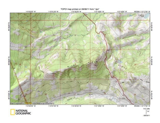 Detailed map of South Fork Milk River-North Fork Cut Bank Creek drainage divide area
