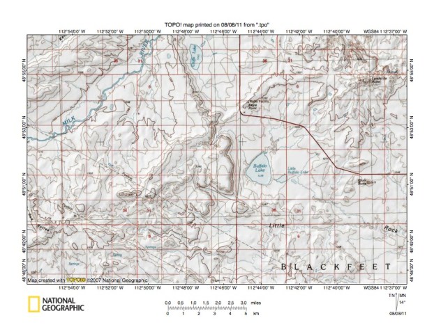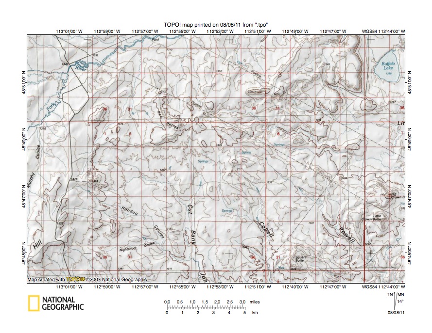 - Figure 5 illustrates the Milk River-Little Rock Coulee drainage divide area south and west of the figure 3 map area and includes overlap areas with figure 3. The Milk River flows in a northeast direction in the figure 5 northwest quadrant. Landslide Butte is located near the figure 5 northeast corner and reaches an elevation 1419 meters. Little Rock Coulee drains in an east-southeast direction in the figure 5 southeast quadrant to the figure 5 east edge. South and east of figure 5 Little Rock Coulee turns to flow in a south-southeast direction and to join Cut Bank Creek. The South Fork Little Rock Coulee drains in a southeast direction near the figure 5 south center edge and joins Little Rock Coulee south and east of the figure 5 map area. Note how between Croffs Lake (near figure 5 north center edge) and Buffalo Lake there is a through valley linking the northeast-oriented Milk River valley with the east-southeast oriented Little Rock Coulee valley. Locally the through valley appears to be shallow with elevations at Eagle Point being between 1300 and 1320 meters while the narrow inner through valley floor at the drainage divide has an elevation of between 1260 and 1280 meters. However continue further in each direction to see how elevations rise. Landslide Butte as mentioned reaches 1419 meters. Elevations greater than 1420 meters can be found at several points in the figure 5 southwest quadrant. In other words the through valley between Croffs Lake and Buffalo Lake is in fact just a deep channel eroded into the floor of a much broader and deeper northwest-southeast oriented through valley which is at least 140 meters deep in the Croffs Lake-Buffalo Lake channel region. This broad northwest-southeast oriented through valley was eroded by massive southeast-oriented melt water flood flow moving to what at that time was the actively eroding Cut Bank Creek valley. At that time the northeast-oriented Milk River valley did not exist and flood waters initially flowed on a surface at least as high as the highest figure 5 elevations today. Headward erosion of the deep northeast-oriented Milk River valley then captured the southeast-oriented flood flow while flood waters on north and northwest ends of beheaded flood flow routes reversed flow direction to erode what are today the short north and north-northwest oriented Milk River tributary valleys seen in figure 5. Note the presence of other northwest-southeast shallow through valleys or channels eroded into the floor of the much broader figure 5 northwest-southeast oriented flood flow channel.