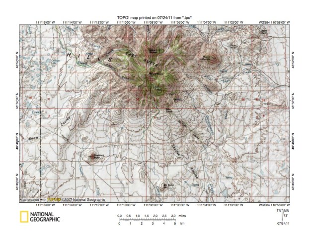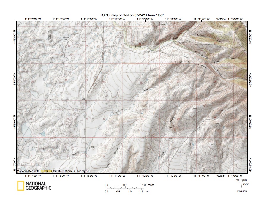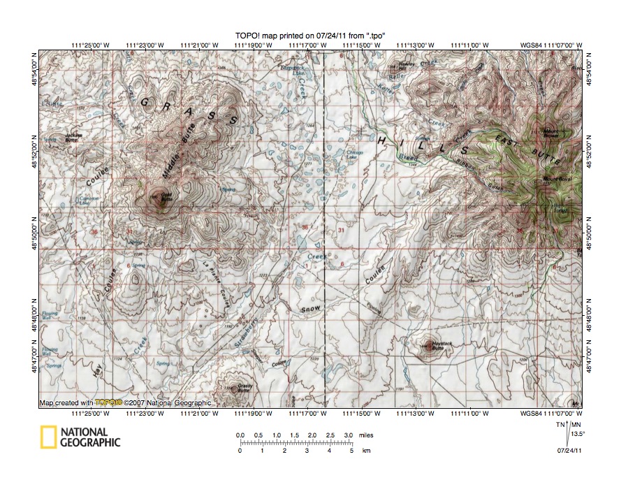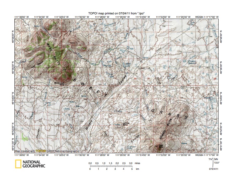 - Figure 5 illustrates the Breed Creek-Strawberry Creek drainage divide area west of the figure 3 map area and includes overlap areas with figure 3. East Butte can be seen near the east edge of the figure 5 northeast quadrant. Middle Butte is located west of East Butte in the figure 5 northwest quadrant with Gold Butte being the highest point in the Middle Butte. Middle Butte is a relatively small mass, which reaches an elevation of 1985 meters, which is lower, but still close to the elevations of Mount Brown (2121 meters) and Mount Royal (2107 meters) considering elevations in the figure 5 southwest corner are less than 1100 meters. Between East Butte and Middle Butte is a region of hummocky topography, which based on the figure 5 map evidence could be considered a glacial moraine area. However, evidence that large south-oriented melt water floods crossed the region suggest other possibilities as well. One possibility is the large melt water floods late during the ice sheet melt down history rafted numerous icebergs containing glacially transported debris with the icebergs becoming stranded in the rising Sweet Grass Hills region as headward erosion of the deep east-oriented Milk River valley to the north aided by continuing uplift in the Sweet Grass Hills region caused south-oriented flood flow on north ends of beheaded flood flow to reverse flow direction and to flow in a north direction. Breed Creek can be seen in figure 5 originating just west of the through valley between Mount Brown and Mount Royal near the east edge of the figure 5 northeast quadrant. Note how west of the East Butte upland area Breed Creek turns to flow in a north-northwest direction to the figure 5 north edge (and to join the east-oriented Milk River north of the figure 5 map area). Strawberry Creek originates in the figure 5 east center area (just south of where northwest-oriented Ribbon Gulch joins a southwest-oriented Breed Creek valley segment) and then flows in a southwest direction to the figure 5 south edge (west half). South of figure 5 Strawberry Creek joins a south-oriented Trail Creek, which then joins south-oriented Willow Creek, which flows to the Marias River. Note how the region between East Butte and Middle Butte is the north-south drainage divide between north-oriented streams flowing to the east-oriented Milk River and south-oriented streams flowing to the Marias River. In a sense this region between the two buttes could be considered a huge through valley eroded by south-oriented melt water floods, which were beheaded and reversed by headward erosion of the east-oriented Milk River valley to the north. This interpretation requires deep erosion of easily eroded bedrock material surrounding the erosion resistant East Butte and Middle Butte rock masses. Based on present day elevations it appears more than 1000 meters of surrounding bedrock material was removed. However, the depth of the surrounding bedrock erosion may have been less as in figures 7 and 8 there is evidence the Sweet Grass Hills butte region was being uplifted as flood waters flowed across it.
