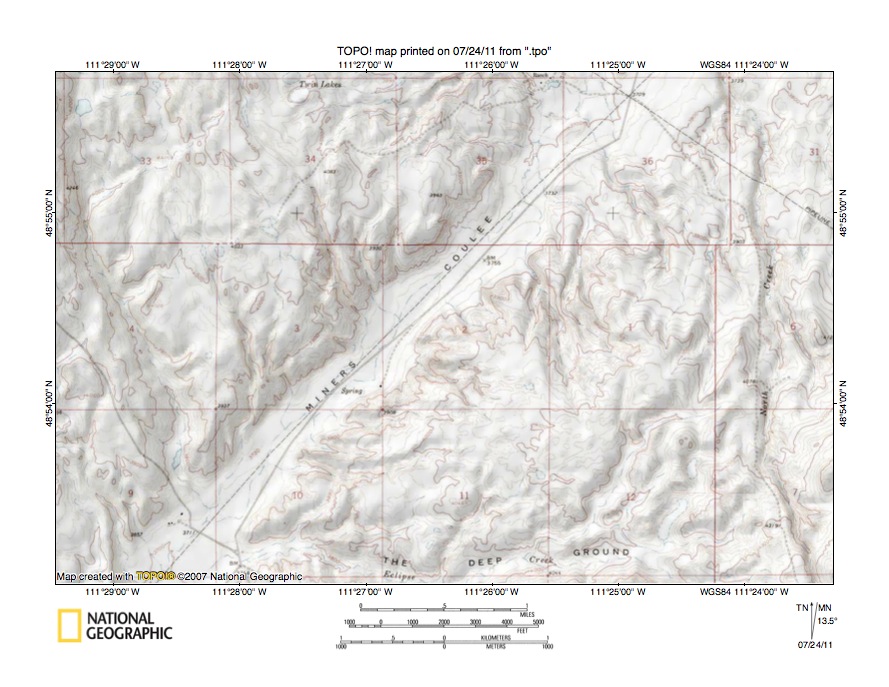 - Figure 8 illustrates a detailed topographic map of the Miners Coulee drainage divide area seen in less detail in figure 7 above. Miners Coulee is labeled and is the continuous northeast to southwest oriented through valley extending from the figure 8 north edge (east half) to the figure 8 south edge (west half). Today the drainage divide between a north-oriented stream flowing to the Milk River to the north of figure 8 (in Alberta) and a south-oriented stream flowing eventually to the Marias River to the south of figure 8 is located near the north center of section 2. A bench mark in the valley at the drainage divide is shown as having an elevation of 3755 feet. The map contour interval is 20 feet and a spot elevation of 4083 feet is located in section 34 to the northwest of the valley drainage divide with a spot elevation of 4266 feet near the west edge of the figure 8 northwest quadrant (much higher elevations are found north and west of figure 8). Elevations rise to more than 4319 feet near the figure 8 southeast corner (much higher elevations are found south and east of figure 8). Depending on how the Miners Coulee valley is defined the valley could be considered to be between 200 feet deep and more than 3000 feet deep, although figure 8 evidence only documents a few hundred feet of depth. Note how north of the Miners Coulee drainage divide there is a northeast-oriented stream flowing to the figure 8 north edge where the elevation is less than 3690 feet. Also note how south of the Miners Coulee drainage divide there is a southwest-oriented stream flowing to the figure 8 south edge where the elevation is less than 3700 feet. This through valley when it was eroded was a continuous southwest-oriented flood flow channel with a continuous gradient from the northeast to the southwest. A reversal of flood flow in the north end of the valley did occur after headward erosion of the deep Milk River valley beheaded the south-oriented flood flow channel. The north-oriented stream gradient could have been eroded by the reversed flood flow, although another possibility is the drainage divide also developed as the Sweet Grass Hills region was being uplifted. Sweet Grass Hills region uplift would probably have been taking place as the southwest-oriented flood flow channel was moving flood water across the region and as the deep east-oriented Milk River valley was eroding headward across southern Alberta to the north of figure 8.