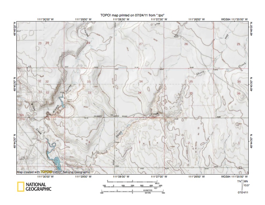 - Figure 10 illustrates a detailed topographic map of the Deer Creek-Fred and George Creek drainage divide area seen in less detail in figure 7 above and shows a region in the north half of the Sweet Grass Hills West Butte upland area. The Alberta-Montana border is just north of the figure 10 map area. The highest point in the West Butte area is located south of the figure 10 map area. Deer Creek originates in the section 13 southeast corner and flows in a north, northwest, and north direction to the figure 10 north edge (north of section 1 in the figure 1 northwest quadrant). North of the figure 10 map area Deer Creek water flows to the east-oriented Milk River in Alberta. Fred and George Creek flows as a north-northeast oriented stream in the west half of section 19 and then turns to flow in a southeast direction to the figure 10 south edge (east half). South and east of figure 10 Fred and George Creek turns to flow in a northeast direction to join the north-oriented Miners Coulee drainage route and to flow to the east-oriented Milk River in Alberta. McDonald Creek is the northeast-oriented stream flowing from the northwest corner of section 18 to the figure 10 north edge (west of figure 10 northeast corner). South-oriented streams originating in sections 23 and 24 (near the figure 10 southwest corner) flow to Willow Creek, which in turn flows to the east-oriented Marias River. Note in the northeast corner of section 24 and northwest corner of section 19 an east-oriented tributary draining to the elbow of capture where north-northeast oriented Fred and George Creek turns to flow in a southeast direction. Further note in the section 24 northeast corner area two through valleys linking the headwaters of that east-oriented tributary valley with the north-oriented Deer Creek headwaters valley. The map contour interval is 20 feet and the through valley floor elevations are between 5240 and 5260 feet and 5280 and 5300 feet. Another through valley in the section 18 southwest corner region links the northeast-oriented McDonald Creek valley with the southeast-oriented Fred and George Creek valley. This section 18 through valley has a floor elevation at the drainage divide of between 5040 and 5060 feet. The high point in section 24 to the southwest is marked as 6102 feet and the high point in the section 18 southeast corner area is 5652 feet. How deep the through valleys are can be debated, although they provide evidence of multiple south-oriented flood flow routes to the southeast-oriented Fred and George Creek valley, which probably at that time was a south-oriented valley being eroded by south-oriented flood flow. Headward erosion of the deep east-oriented Milk River valley in southern Alberta (just to the north of figure 10) beheaded and reversed the south-oriented flood flow routes in sequence from east to west to erode the present day north-oriented drainage routes.