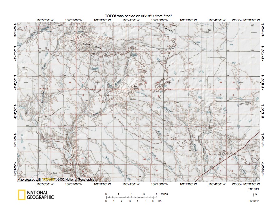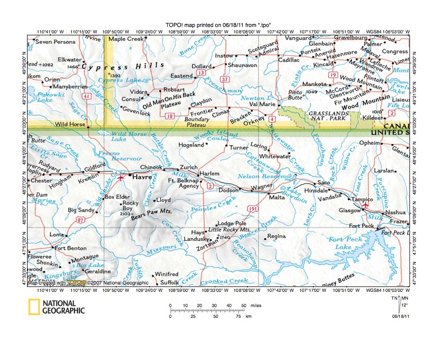 - Figure 1 provides a location map for the Battle Creek-Savoy Creek drainage divide area and illustrates a region in extreme north central Montana with southwest Saskatchewan and the Alberta southeast corner north of the international border. The Missouri River flows in a northeast direction from the figure 1 west edge (just north of southwest corner) to Fort Benton and Loma before turning to flow in a southeast and east-northeast direction around the south side of the Bears Paw Mountain and then flowing in an east-southeast and east-northeast direction to Fort Peck Dam. The Milk River flows in a southeast direction from the figure 1 west edge (just north of the international border) to Havre, Montana and then flows in an east and east-southeast direction to Harlem and Malta, before making a jog to the north-northeast and then flowing in a southeast direction to join the Missouri River just downstream from Fort Peck Dam. Battle Creek is a south-southeast oriented Milk River tributary originating in the Cypress Hills region near the Saskatchewan southwest corner and joining the Milk River near Chinook, Montana. Lodge Creek is a southeast-oriented Milk River tributary immediately west of Battle Creek. The unnamed southwest and southeast-oriented stream east of Battle Creek and joining the Milk River near Harlem, Montana is Thirtymile Creek. Savoy Creek is not shown on figure 1, but is a southeast-oriented stream located east of Thirtymile Creek. North of the Thirtymile Creek headwaters is east-northeast, east, and south oriented Woody Island Coulee, which drains to southeast-oriented Cottonwood Creek, which flows to the north-northeast oriented Milk River segment. The Woody Island Coulee-Milk River drainage divide area landform origins essay describes the region immediately to the east and northeast of the Battle Creek-Savoy Creek drainage divide study region investigated in this essay. Milk River essays are listed under Milk River on the sidebar category list.