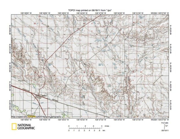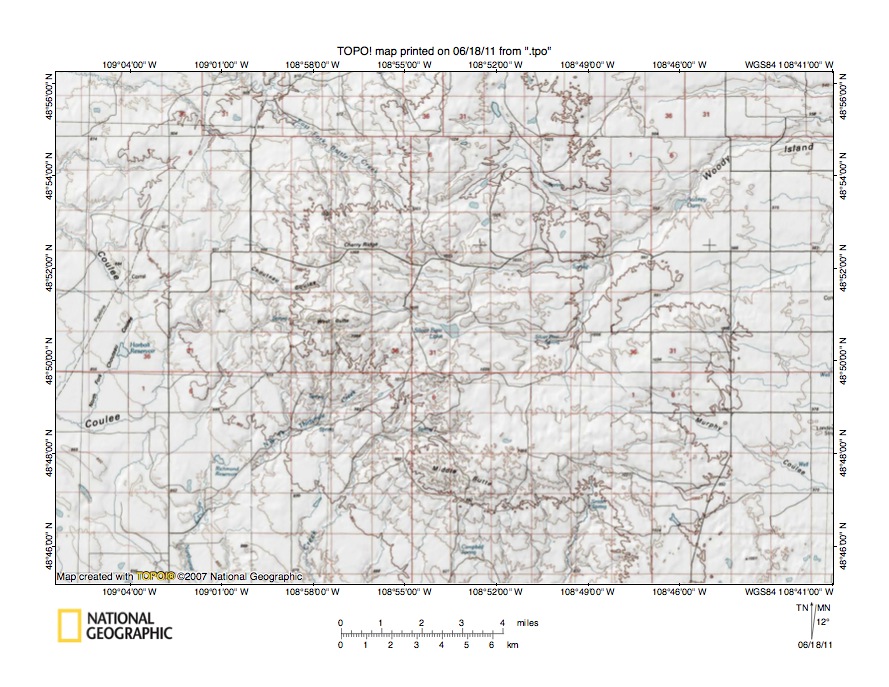 - Figure 5 illustrates the East Fork Battle Creek-Woody Island Coulee drainage divide area north and west of the figure 4 map area and includes overlap areas with figure 4. Middle Butte is the labeled high area in the figure 5 south center region and as seen in figure 5 forms the south rim of an east and northeast-oriented amphitheater shaped basin drained by east and northeast-oriented Woody Island Coulee, which is labeled in the figure 5 northeast quadrant. Other labeled high areas along the rim of amphitheater-shaped basin are West Butte and Cherry Ridge. Elevations along the rim of this east and northeast-oriented amphitheater-shaped basin are generally greater than 1060 meters with elevations decreasing in all directions, although the elevation decrease is much more rapid and greatest in a southwest direction. The Northwest Fork Thirtymile is labeled and flows in a southwest and south-southeast direction in the figure 5 southwest quadrant from the region between West Butte and Middle Butte to the figure 5 south edge (west half) and south of the figure 5 map area joins Thirtymile Creek, which then flows to the Milk River. Originating between Cherry Ridge and West Butte is west, southwest, and west oriented Chouteau Coulee, which west of the figure 5 map area drains to south-southeast oriented Battle Creek. Originating north of Cherry Ridge and flowing in a northwest direction are the headwaters of the East Fork Battle Creek. The east and northeast-oriented amphitheater shaped basin is what is left of an abandoned headcut which was eroded by immense east and northeast-oriented melt water floods moving across the figure 5 map area prior to the erosion phase in which the deep Milk River valley and its tributary valleys were eroded. At that time there was no deep Battle Creek valley to the west of the figure 5 map area and there was no deep Milk River valley south of the figure 5 map area. Elevations throughout the entire region were at least as high as the tops of Cherry Ridge, West Butte, and Middle Butte and the southwest margin of the decaying ice sheet was located east and north of the figure 5 map area. Immense southeast-oriented melt water floods were captured by headward erosion of deep east and/or northeast oriented valleys which eroded headward from an ice-walled and ice-floored canyon located on the decaying ice sheet’s surface (located north and east of figure 5). The northeast-oriented Woody Island Coulee valley segment is probably a relic of that flood flow movement. Headward erosion of southeast-oriented Milk River tributary valleys east of the figure 5 map area then began to capture the northeast-oriented flood flow, while headward erosion of the deep Milk River valley and Battle Creek valleys south and west of the figure 5 map area subsequently cut off all flood flow from the southwest and west and also surrounded the upland surface with deep valleys east and northeast of the abandoned headcut on at least three sides (to the north is the east and southeast-oriented Frenchman River valley in Saskatchewan, which is another Milk River tributary). The northwest-oriented East Fork Battle Creek valley segment was eroded by a reversal of flood flow on the northwest end of a southeast-oriented flood flow channel beheaded by headward erosion of the southwest-oriented East Fork Battle Creek valley segment, which is seen in figure 6 below.