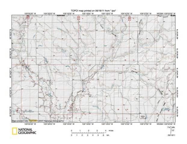- Figure 10 provides a detailed topographic map of the Coyote Coulee-Coal Creek drainage divide area seen in less detail in figure 9 above. Coyote Coulee is labeled and is located in the figure 10 northwest quadrant and drains to south-oriented Dry Fork Battle Creek in section 14 along the figure 10 west edge. Note how Coyote Coulee has a significant southeast-oriented tributary, which north of the figure 10 map area is linked by a through valley with the southwest-oriented Deadhorse Coulee valley. Also note the short northwest-oriented Coyote Coulee tributary valleys from the south. Boxelder Coulee is the west and southwest oriented “Coulee” located in sections 19 and 24 near the figure 10 south edge. Coal Creek is labeled as both Coal Creek and Coal Coulee and is located in the figure 10 east half. In the figure 10 northeast quadrant Coal Creek drains in a south-southeast direction and then turns in section 16 to flow in a south-southwest direction to section 20, where it joins a southeast-oriented valley to flow to the figure 10 south edge (near the southeast corner). Note how the southeast-oriented valley Coal Creek joins is linked by a through valley in section 20 with a west-oriented Coyote Creek tributary valley. The map contour interval is ten feet and the through valley floor elevation is between 2650 and 2660 feet. Elevations in the section 19 northwest quadrant rise to more than 2690 feet and elevation to the northeast of the through valley rise much higher. The northwest-southeast oriented through valley is eroded into the face of the southwest-facing slope and is a relic of southeast-oriented flood flow responsible for eroding the much larger Battle Creek valley. At the time the through valley was eroded the deep Battle Creek valley was also being eroded and flood waters along the east edge of the southeast-oriented Battle Creek valley were still moving to the southeast-oriented Coal Creek valley, which had been eroded slightly in advance of the larger Battle Creek valley. Milk River tributary valleys were eroded in sequence from east to west as the actively eroding Milk River valley head eroded into what was then a high level topographic surface at least 200 meters higher than the present day Milk River valley floor. As the deep Battle Creek valley and its tributary valleys eroded headward flood waters began to flow in a southwest direction down the newly eroded southwest-facing slope. Headward erosion of the southwest-oriented Coyote Coulee valley and its west-oriented tributary valley then beheaded the southeast-oriented flood flow route to the southeast-oriented Coal Creek valley and diverted the southeast-oriented flood flow to the newly eroded south-oriented Dry Fork Battle Creek valley.