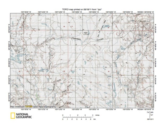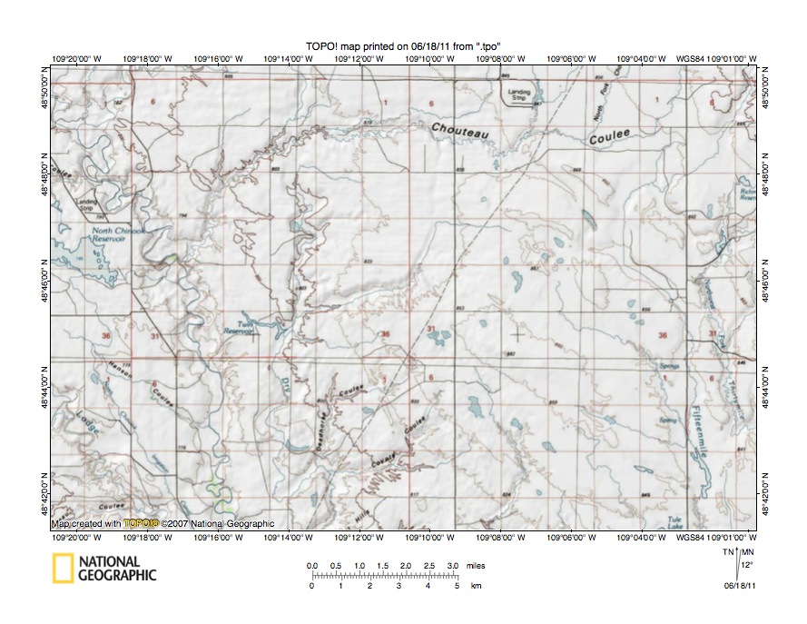 - Figure 7 illustrates the Chouteau Coulee-Thirtymile Creek drainage divide area south and slightly east of the figure 6 map area and includes overlap areas with figure 6. Battle Creek flows in a south-southeast direction from the figure 7 west edge (north half) to the figure 7 south edge (west half). West Butte is located near the figure 7 northeast corner and Chouteau Coulee drains in a west, south-southwest, west, and southwest direction from north of West Butte to join Battle Creek east of North Chinook Reservoir near the figure 7 west center edge. South of Chouteau Coulee in the figure 7 west half is south-oriented Dry Fork Battle Creek, which joins Battle Creek south of the figure 7 map area. The unnamed south-southeast, south-southwest, and southeast oriented stream flowing to the figure 7 south center edge is Coal Creek, which south of the figure 7 map area flows directly to the Milk River. East of Coal Creek along the figure 7 south edge is Tule Lake and east of Tule Lake is southeast and south-oriented Fifteenmile Creek. East of Fifteenmile Creek is the Northwest Fork Thirtymile Creek, which flows in a southwest direction from the south side of West Butte and then turns to flow in south-southeast direction to join south-southwest and south oriented Thirtymile Creek near the figure 7 southeast corner. Note the range of elevations in the figure 7 map area. West Butte in the figure 7 northeast corner area rises to more than 1060 meters. The Battle Creek valley floor near the figure 7 west edge has an elevation of less than 800 meters (the North Chinook Reservoir normal pool level is marked as 786 meters). These elevations indicate the Battle Creek valley was almost 300 meters deep as it eroded headward into the upland surface now represented by high elevations in the West Butte region. Headward erosion of the Chouteau Coulee valley from the Battle Creek valley beheaded south- and southeast-oriented flood flow moving to what were then the actively eroding Dry Fork Battle Creek and Fifteenmile Creek valleys. Shallow through valleys can be seen linking the Fifteenmile Creek valley with the Chouteau Coulee valley. Figure 8 below provides a detailed topographic map to better illustrate the through valleys.