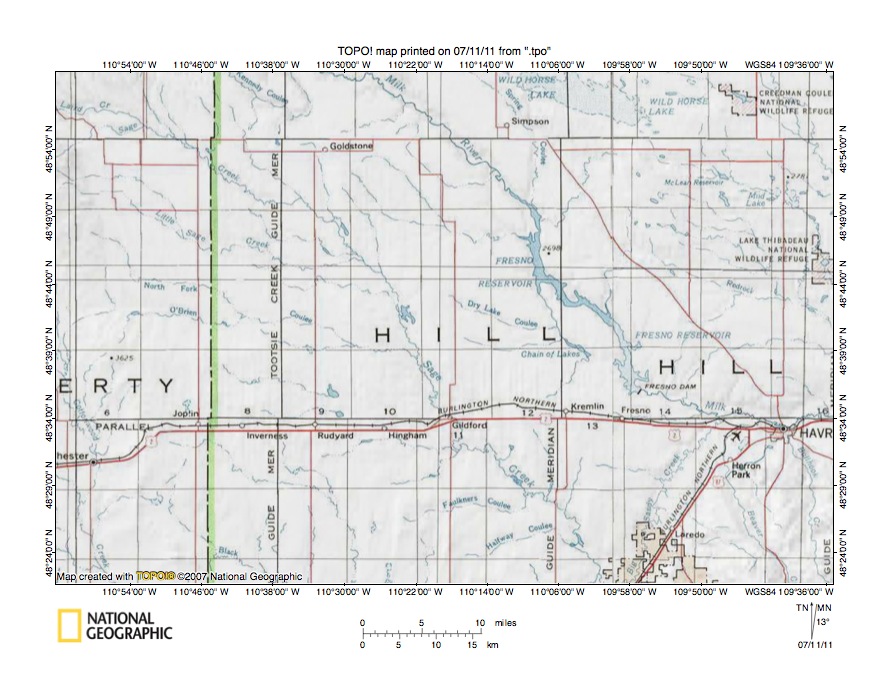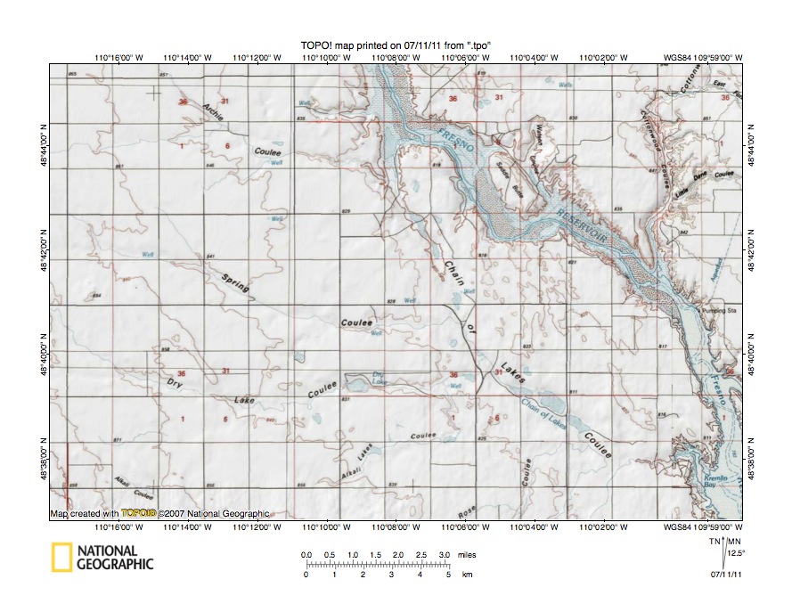 Figure 7: Detailed map of Milk River-Chain of Lakes Coulee drainage divide area. United States Geological Survey map digitally presented using National Geographic Society TOPO software.