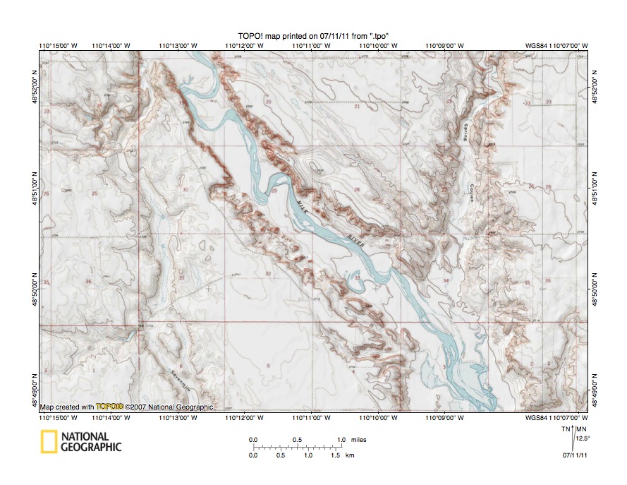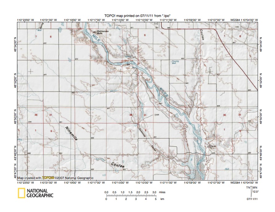 Figure 4: Milk River-Sevenmile Coulee drainage divide area. United States Geological Survey map digitally presented using National Geographic Society TOPO software.