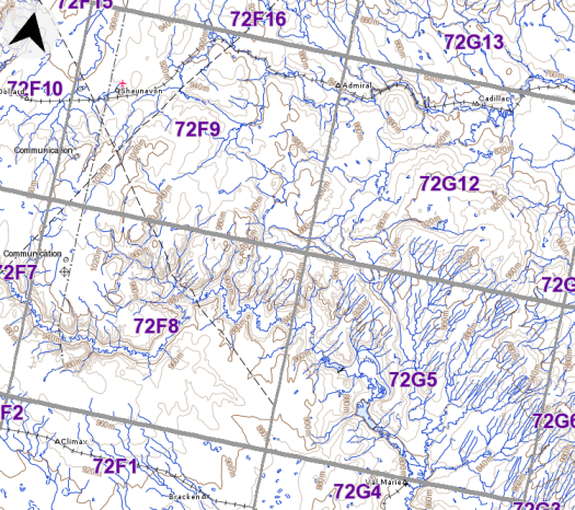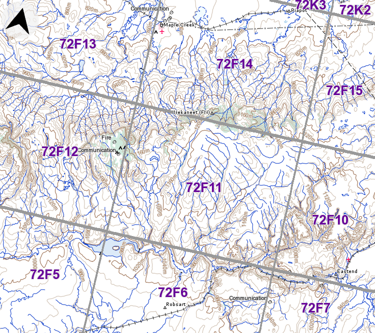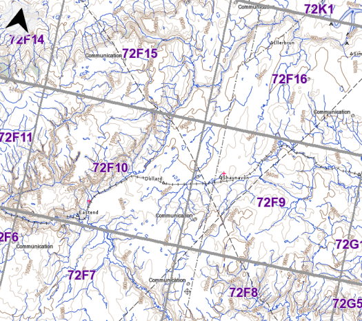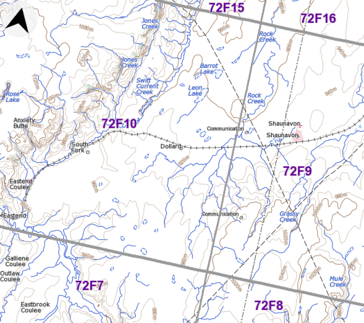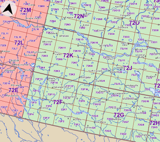 - Figure 1 illustrates a location map for the South Saskatchewan River-Frenchman River drainage divide area in southwest Saskatchewan and is an index map from the Atlas of Canada Toporama website. Numbers defining areas in the large grid identify hard copy 1:250,000 scale topographic maps and numbers in the more detailed grid identify hard copy 1:50,000 scale topographic maps. Large grid maps 72K, 72F, 72J, and 72G are located in southwest Saskatchewan with Montana (in the United States) being located to the south and Alberta being located to the west. The South Saskatchewan River is labeled in (large grid) map 72K and flows in a northeast direction in Alberta before entering Saskatchewan. Once in Saskatchewan the South Saskatchewan River flows in an east and southeast direction before turning to flow in a northeast, north-northwest, and northeast direction and eventually the water reaches Hudson Bay. The Frenchman River originates at Cypress Lake (shown, but not labeled near corner of small grid maps 72F5, 72F6, 72F11, and 72F12) and flows in an east and southeast direction to the international border in map 72G3 and south of the figure 1 map area joins the Milk River, with water eventually reaching the Gulf of Mexico. The South Saskatchewan River-Frenchman River drainage divide discussed in this essay is also the north-south continental divide. Note the lack of major South Saskatchewan River tributaries from the south. The one exception is Swift Current Creek, which originates in the northeast quadrant of large grid map 72F and then flows in a northeast and north-northwest direction to join the South Saskatchewan River in large grid map 72J. Most other drainage routes shown between the South Saskatchewan River and the Frenchman River end up in interior drainage basins with no modern-day outlet, although through valleys seen on the topographic maps provide evidence of former drainage routes. The South Saskatchewan River-Frenchman River drainage divide area investigated in this knol is located in large grid maps 72F and 72K. The Frenchman River-international border region landform origins essay discusses regions south of the Frenchman River and north of the United States border. Milk River drainage divide essays are listed under Milk River on the sidebar category list.