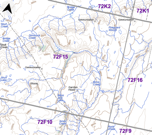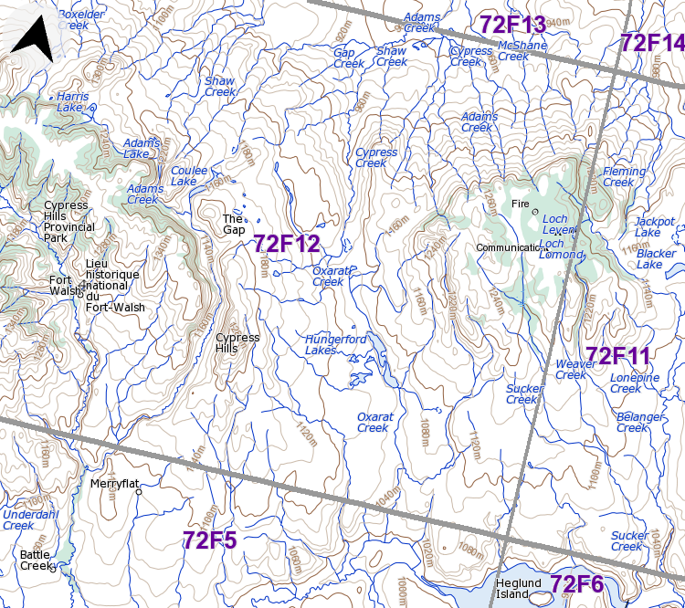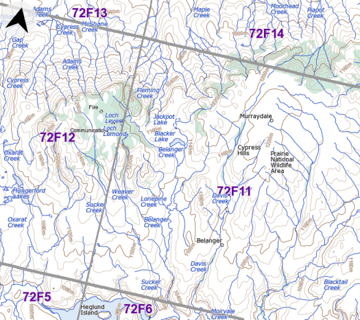 - Figure 9 uses a 1:150,000 scale Toporama topographic map to illustrate the Maple Creek-Frenchman River drainage divide area seen in less detail in figure 8 above. The Frenchman River originates at Cypress Lake (near map 72F5 northeast corner and map 72F6 northwest corner) and flows in an east direction south of the figure 9 map area. Cypress Lake is formed by a dam, which has raised the water level to the point where it can also drain in a west direction to south-oriented Battle Creek in the figure 9 southwest corner. Belanger Creek is a south-oriented Frenchman River tributary draining the through valley near the west margin of map 72F11. Note how Belanger Creek originates almost on the crest of the north-facing Cypress Hills slope and drains in a southwest direction to Jackpot Lake and then in a south direction along the south end of the through valley. North of the Belanger Creek headwaters are headwaters of north-oriented Maple Creek, while the through valley north end is drained by north-oriented Fleming Creek. Through valley floor elevations in the Jackpot Lake area are between 940 and 960 meters meaning the through valley is at least 60 meters deep. Note how other south-oriented Frenchman River tributaries originate on the Cypress Hills upland surface almost at the edge the north-facing Cypress Hills slope. For example just west of the fire tower in map 72F12 a south-southeast oriented Frenchman River tributary originates at an elevation of 1240 meters while just to the north Adams Creek headwaters flow in a north direction down the steep north-facing Cypress Hills slope. The south-southeast oriented Frenchman River tributary valley was eroded by south-southeast oriented ice-marginal flood flow moving to what at that time was the actively eroding Frenchman River valley. At that time the region north of the Cypress Hills was at least as high as the present 1240 meter high Cypress Hills upland surface today (and the deep through valleys on either side had yet to be eroded). Reversals of flood flow north of the Cypress Hills upland surface occurred in sequence from east to west meaning southeast-oriented ice-marginal flood flow could be captured by newly reversed flood flow further to the east. Such captures of flood flow produced east-oriented flood flow channels, which helped erode the north-facing Cypress Hills slope. Also, because the high level surface remained longer in the west than in the east the deep through valley along the figure 9 west edge was eroded after the Fleming Creek-Belanger Creek through valley was eroded.