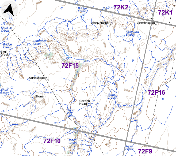 - Figure 7 uses a Toporama 1:150,000 scale topographic map to illustrate Bridge Creek-Swift Current Creek drainage divide area seen in less detail in the figure 5 map area above. Swift Current Creek is not labeled in figure 7, but flows in a north-northeast direction from the northeast corner of map 72F10 across the southeast corner of map 72F15 into map 72F16 and then to the figure 7 east edge (north half). Bone Creek originates near Black Hole Lake (near south edge of map 72F15) and flows in a north, east, and south direction to join north-northeast oriented Swift Current Creek. Jones Creek flows in a south direction from the Black Hole Lake area to the figure 7 south center edge and as seen in figure 6 eventually joins north-oriented Swift Current Creek south of the figure 7 map area. North-oriented Rock Creek flows from the northwest corner of map 72F9 to join Swift Current Creek in map 72F16. Bridge Creek originates as a northwest-oriented stream and then after flowing down the Cypress Hills northwest facing slope turns to flow in a northeast direction along the base of the west-northwest facing Cypress Hills slope. Note how Bridge Creek is shown as a discontinuous drainage route. North of the figure 7 map area Bridge Creek turns to flow in a north direction and then ends in a lake with no modern-day outlet (although should it overflow the flow would end up in the South Saskatchewan River). Note how in map 72F15 a northwest-oriented Bridge Creek tributary is linked by a well-defined through valley with the east and south-oriented Bone Creek valley segment. The through valley has been eroded into the Cypress Hills upland surface and has a valley floor elevation of between 880 and 900 meters. The Cypress Hills upland surface on either side of the through valley rises to more than 1020 meters (even more to west) indicating the through valley is at least 120 meters deep. Note also elevations of 820-840 meters where the northwest-oriented tributary joins northeast-oriented Bridge Creek indicating the region north and west of the Cypress Hills upland is significantly lower than the through valley floor. The through valley was eroded by southeast-oriented melt water flood flow first moving to the Milk River drainage system in the south (including via the actively eroding Frenchman River valley). Reversal of the south-oriented flood flow in the east half of the figure 7 map area then eroded the north-northeast oriented Swift Current Creek valley while southeast-oriented flood flow still moved across the Cypress Hills upland region, which means the area north and west of the Cypress Hills upland was at least as high as the upland is today. Some or all of the high elevation may have been due to the presence of ice, although some of the elevation may have been due to bedrock which was removed by ice-marginal flood flow which was subsequently reversed to flow along the Cypress Hills base and then in a north direction to the actively eroding South Saskatchewan River valley.