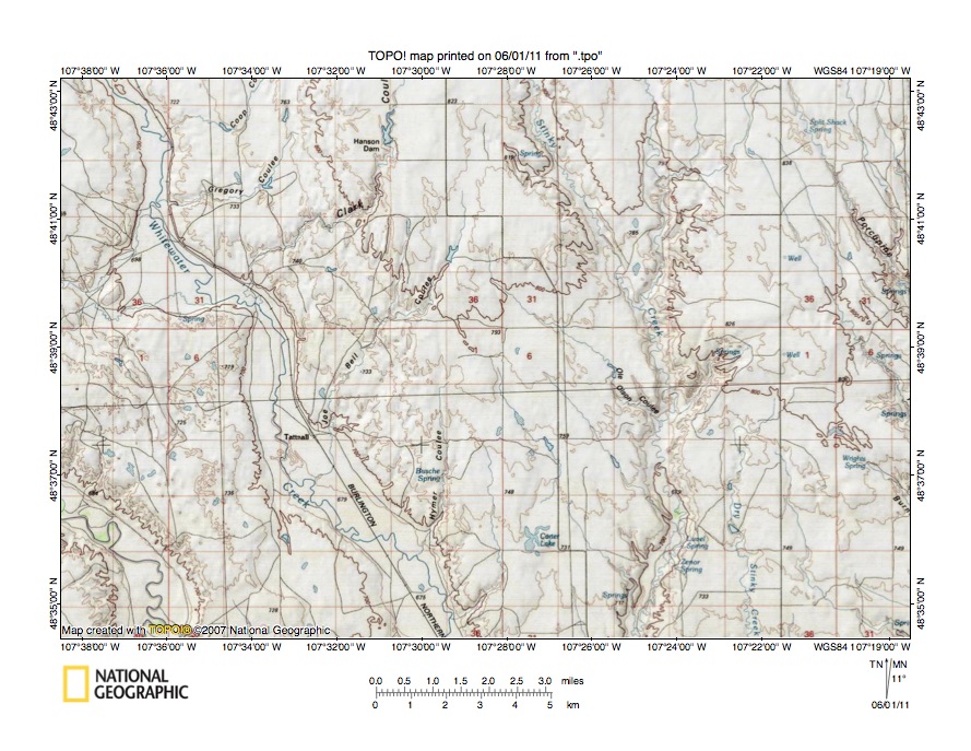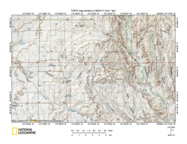 - Figure 5 illustrates the Whitewater Creek-Stinky Creek drainage divide area south and west of the figure 4 map area and includes overlap areas with figures 3 and 4. The southeast-oriented stream in the figure 5 southwest corner is the Milk River. Whitewater Creek flows in a south-southeast direction from the figure 5 northwest corner to the figure 5 south edge (west of center). Whitewater Creek tributaries from the east and north begin generally as south-oriented drainage routes and then drain in south-southwest, southwest directions, or west directions. From north to south these tributaries include Coop Coulee, Gregory Coulee, Clark Coulee, Bell Coulee, Hymer Coulee. The change in orientation from south-oriented drainage routes to more of west oriented drainage routes probably occurred as headward erosion of the deep south-southwest oriented Whitewater Creek valley was capturing what was at that time generally south-oriented flood flow. The map contour interval is 20 meters and the Whitewater River is approximately 100 meters deep (using elevations on uplands on either side of the valley including an upland slightly west of figure 5). Note how the south-southwest facing Whitewater Creek valley wall has been eroded by the south-southeast and southwest oriented streams and what must have general overland flood flow moving into what was then the actively eroding and deep Whitewater Creek valley. To the east south-oriented Stinky Creek has several south-southeast oriented tributary valleys. The multiple closely spaced and roughly parallel south-southeast oriented tributaries provide evidence Stinky Creek valley headward erosion captured multiple south-southeast oriented flood flow routes. A through valley links headwaters of Ole Olson Coulee with the south-southwest oriented Bell Coulee headwaters valley. The through valley provides evidence Bell Coulee valley headward erosion from what was then the actively eroding Whitewater Creek valley beheaded the flood flow to the actively eroding Ole Olson Coulee valley. South-southeast oriented Frenchman River tributaries can be seen flowing to the figure 5 east edge. Again the figure 5 map evidence suggests headward erosion of the Frenchman River valley and its tributary valleys captured massive south-oriented flood flow in the region slightly in advance of headward erosion of the Stinky Creek valley and its tributary valleys, which captured the south-oriented flood flow slightly in advance of Whitewater Creek valley headward erosion.