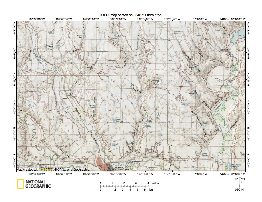 - Figure 1 provides a location map for the Whitewater Creek-Frenchman River drainage divide area in northeast Phillips County, Montana and illustrates a region in north central Montana with southwest Saskatchewan north of the international border. The Missouri River flows from the figure 1 west edge (south half) to Fort Peck Reservoir and then flows in an east direction to the figure 1 east edge. The Milk River is located north of the Missouri River and flows from the figure 1 west edge near the international border to Fresno Reservoir, Havre, Harlem, and Malta before making a jog to the northeast and then flowing in a southeast direction to join the Missouri River a short distance downstream from Fort Peck Dam. The Frenchman River originates in the Cypress Hills region in the figure 1 northwest corner area and flows in an east and east-southeast direction to the west unit of Grasslands National Park before flowing in a south direction to join the Milk River a short distance north of Saco, Montana. Whitewater Creek originates just north of the international border and west of the Grasslands National Park West Unit and flows in a southeast direction to join the Milk River near Nelson Reservoir. The Whitewater Creek-Frenchman River drainage divide area investigated in this essay is located south of the international border, north of the Milk River, west of the Frenchman River and east of Whitewater Creek. A previous essay addressed Frenchman River-Rock Creek drainage divide area landform origins in the region directly east of the study region. Additional regional drainage divide area essays, including drainage divide areas south of the Milk River and drainage divide areas north of the international border, are listed under Milk River on the sidebar category list.