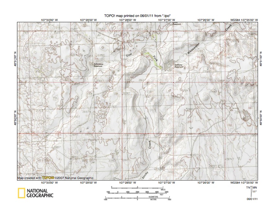 - Figure 7 provides a detailed topographic map of the East Fork Whitewater Creek-Stinky Creek drainage divide area near Salsbery Reservoir. The East Fork Whitewater Creek flows in a west-southwest direction from the figure 7 northeast corner region to Salsbery Reservoir and flows in a west and northwest direction to the figure 7 north edge (west half). Stinky Creek originates near the figure 7 center and flows in a south direction to the figure 7 south edge. Note how a well-defined through valley links the Stinky Creek headwaters with the East Fork Whitewater Creek valley. The map contour interval is 20 feet and the through valley floor elevation is between 2780 and 2800 feet. Hills to the east rise to more than 2900 feet while west of the through valley hills in figure 7 rise even higher. A somewhat less well-defined through valley in the east half of section 31 links the Salsbery Reservoir area with the Stinky Creek valley. Perhaps an even more interesting through valley extends in a south-southwest direction from Schmittou Reservoir (west of Salsbery Reservoir) and then turns in a south-southeast direction to eventually join the Stinky Creek valley south of the figure 7 map area. West of the figure 7 map area additional though valleys can be found linking the north-northwest oriented East Fork Whitewater Creek valley with the south-oriented Stinking Creek valley. These through valleys have higher floor elevations than the through valley linking the Stinking Creek headwaters valley with the East Fork Whitewater Creek, which apparently represented the final south-oriented flood flow channel before headward erosion of the south-oriented East Fork Whitewater Creek valley beheaded and reversed the south-oriented flood flow so as to erode the north-northwest oriented East Fork Whitewater Creek valley. While difficult to interpret from the figure 7 map evidence alone it is possible flood waters were flowing in a region where ice sheet remnants were still present on what are today upland surfaces. Reasons for this suggestion are the hummocky topography observed on detailed topographic maps (not shown) of upland regions west of the figure 7 map area and the difference between the flood flow channels in this region and the closely spaced and parallel flood flow channels captured by Frenchman River valley headward erosion.