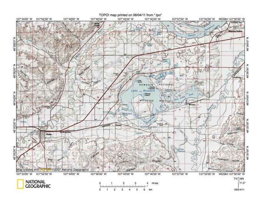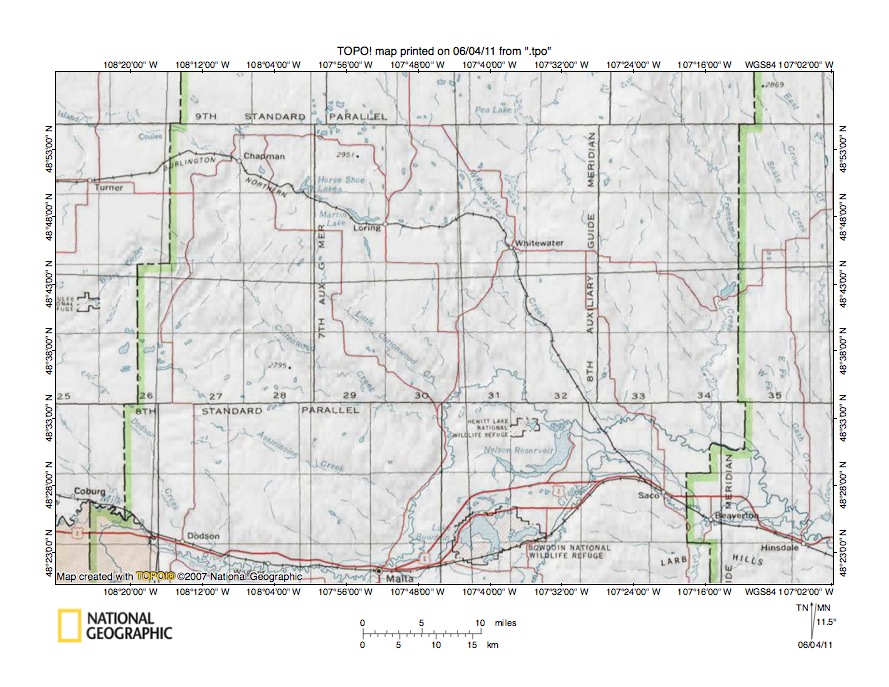 - Figure 2 provides a detailed location map for the Whitewater Creek-Milk River drainage divide area in north central Phillips County, Montana and shows northern Phillips County with Valley County to the east and Blaine County to the west (county boundaries are shown). The west to east oriented United State-Canada international boundary is located just north of the figure 2 north edge. The Milk River flows in an east direction from the figure 2 southwest corner area to Malta (just west of figure 2 south center edge) and then turns to flow in a north-northeast direction to north of the Hewitt National Wildlife Refuge before turning to flow in a southeast direction to the figure 2 southeast corner area. The south-oriented tributary joining the Milk River near the Phillips-Valley County line (near southeast corner) is Frenchman Creek (also known as Frenchman River). The south-southeast oriented tributary joining the Milk River near the intersection of 8th Auxiliary Guide Meridian and the 8th Standard Parallel is Whitewater Creek, which flows through the town of Whitewater. Southeast-oriented tributaries joining the north-northeast oriented Milk River segment from north to south are Little Cottonwood Creek, Cottonwood Creek, and Assiniboine Creek. East of the north-northeast oriented Milk River segment Nelson Reservoir floods a southeast and northeast-oriented Milk River tributary valley and Lake Bowdoin fills another low region. The north-northeast oriented stream east of Lake Bowdoin which turns east of Nelson Reservoir to flow to Saco before joining the Milk River is Beaver Creek and south of the figure 2 map area drains the north end of a large north-south oriented through valley linking the Milk River valley with the Missouri River valley (and the north-oriented Musselshell River valley which today drains to the Missouri River). The south-southeast oriented Whitewater Creek valley and the southeast-oriented Little Cottonwood Creek, Cottonwood Creek, and Assiniboine Creek valleys were probably initiated as flood flow channels which eroded headward from a major south-oriented flood flow channel on the present day north-oriented Beaver Creek alignment. Headward erosion of the deep Milk River valley then captured the south-southeast oriented Whitewater Creek flood flow channel and flood waters on the north end of the beheaded flood flow channel reversed flow direction to erode what is now the north-oriented valley segment flooded by Nelson Reservoir. The southeast-oriented valley segment flooded by Nelson Reservoir is where the reversed flood flow captured the southeast-oriented Little Cottonwood Creek and Cottonwood Creek flood flow channels. The Milk River valley however then eroded headward across the southeast-oriented flood flow channels, capturing the Little Cottonwood Creek, Cottonwood Creek, and Assiniboine Creek flood flow channels and beheading flood flow routes to the newly eroded Nelson Reservoir valley and also to the south-oriented flood flow channel on the Beaver Creek alignment. A reversal of flood flow on the north end of what was the south-oriented Beaver Creek flood flow channel created the north-oriented Beaver Creek valley and also left low areas between the newly eroded north-northeast oriented Milk River valley and the newly reversed north-northeast oriented Beaver Creek valley, which represented the former southeast-oriented Assiniboine Creek flood flow channel and which today are filled by Lake Bowdoin and adjacent lakes.
