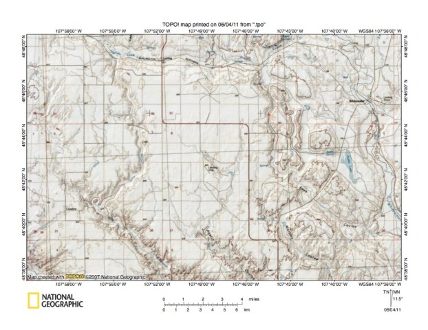 - Figure 7 illustrates the Cottonwood Creek-Assiniboine Creek drainage divide area south and west of the figure 6 map area and includes overlap areas with figure 6. The Milk River flows in a north-northeast direction from the figure 7 south edge (east of center) to the figure 7 northeast corner. In the figure 7 southeast quadrant Lone Tree Sag is a through valley linking the north-northeast oriented Milk River valley with the Nelson Reservoir valley (east of figure 7, but seen in figure 9). Cottonwood Creek flows in a southeast and east-southeast direction from the figure 7 north edge (west of center) to join the Milk River near Fanny Hill in the figure 7 northeast quadrant. Garland Creek is the north and east-southeast oriented tributary joining Cottonwood Creek near the figure 7 north center. The north-oriented Garland Creek headwaters valley was eroded by a reversal of south-oriented flood flow. Assinibione Creek is the east-southeast oriented Milk River tributary in the figure 7 southwest quadrant and joins the north-northeast Milk River south of the figure 7 south center region. Note how north-south oriented through valleys link the Garland Creek valley with the Assiniboine Creek valley. The through valleys were eroded by south-oriented flood flow prior to headward erosion of the deep Cottonwood Creek-Garland Creek valley. The north-northeast oriented Milk River valley, especially the north-oriented valley segment seen in the figure 7 east center region, was eroded by a reversal of south-oriented flood flow, which was beheaded by headward erosion of the deep southeast-oriented Milk River valley and its south-southeast-oriented Whitewater Creek and southeast-oriented Martins Coulee tributary valleys. The Lone Tree Sag is the west end of a through valley linking today the north-northeast oriented Milk River valley with the southeast-oriented Milk River valley to the east (see figure 9). Headward erosion of the deep north-northeast oriented Milk River valley beheaded east-oriented flood flow moving through the Lone Tree Sag through valley, although for a time flood waters flowed both in that east- and north-oriented through valley and in the present day Milk River valley. As previously stated headward erosion of the deep north-northeast oriented Milk River valley captured southeast-oriented flood flow moving to what was then a major south-oriented flood flow channel on what is today the north-oriented Beaver Creek alignment.