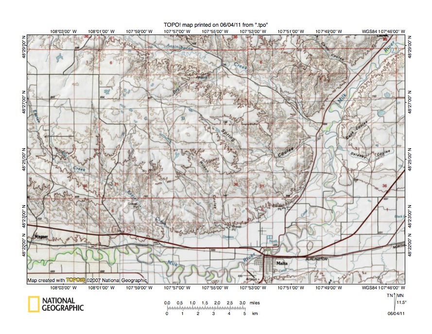 - Figure 8 illustrates the Assiniboine Creek-Milk River drainage divide area south and west of the figure 7 map area and includes overlap areas with figure 7. Wagner is the small town near the figure 8 southwest corner and Malta is the larger town east of the figure 8 south center edge area. The Milk River flows in an east direction near the figure 8 south edge from Wagner to Malta and then turns to flow in a north-northeast direction to the figure 8 northeast corner. Exeter Creek flows in a south-southeast and southeast direction from the figure 8 west edge (north half) to join the east-oriented Milk River in the figure 8 southwest quadrant. Assininboine Creek flows in a southeast direction from the figure 8 north edge (west half) to join the north-northeast oriented Milk River just north of the figure 8 east center area. South of Assiniboine Creek is southeast, east, and east-northeast oriented Spring Coulee, which joins Assiniboine Creek at the point where Assiniboine Creek joins the Milk River. Note how the southeast-oriented Spring Coulee valley is linked by a through valley with the northeast-oriented Dry Fork valley, which drains to southeast-oriented Assiniboine Creek. The through valley is evidence headward erosion of the northeast-oriented Dry Fork valley beheaded a southeast-oriented flood flow channel on the Spring Coulee alignment. The southeast-oriented Milk River tributary valleys were eroded by southeast-oriented flood flow captured by headward erosion of the deep Milk River valley. Prior to Milk River valley headward erosion the southeast-oriented flood flow had been moving to the major south-oriented channel located on what is today the north-oriented Beaver Creek alignment. Headward erosion of the deep Milk River valley beheaded flood flow routes to that south-oriented flood flow channel. The railroad line east of Malta is located in a broad through valley eroded by east-oriented flood flow moving towards the present day Beaver Creek valley. Figure 10 illustrates regions east of figure 8.