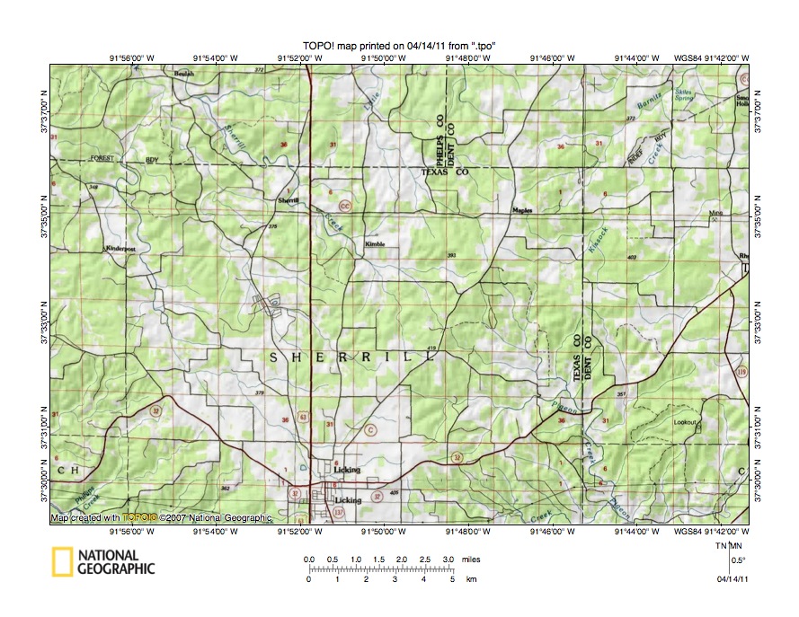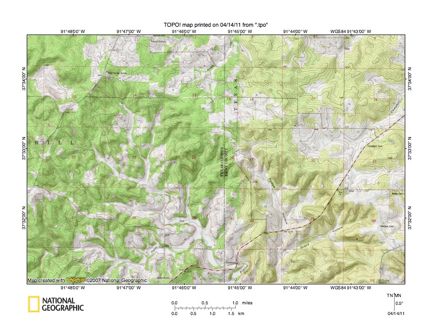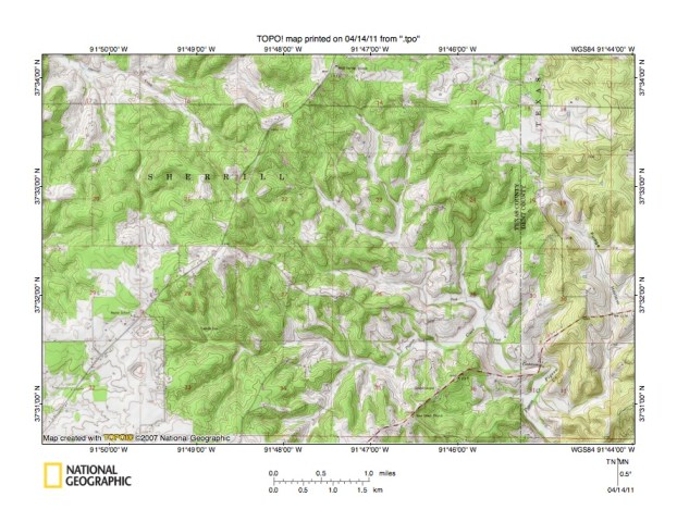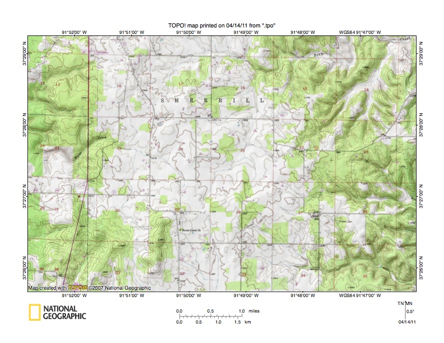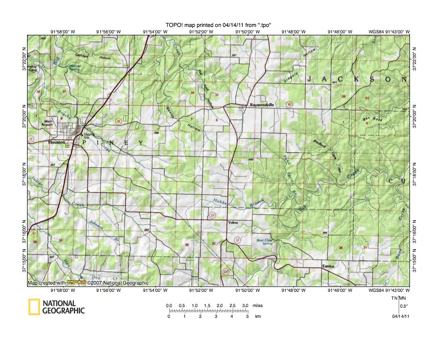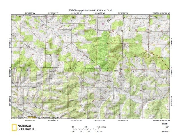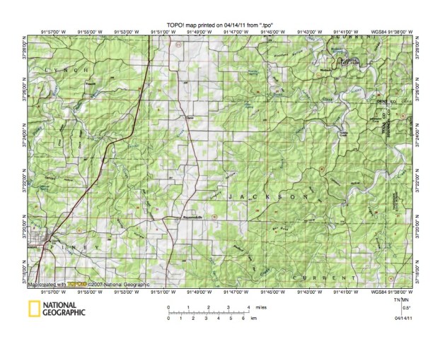 Figure 6: Big Piney River-Big Creek drainage divide area. United States Geological Survey map digitally presented using National Geographic Society TOPO software.