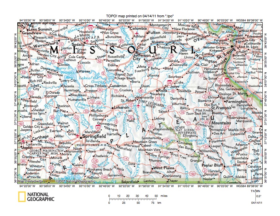 Figure 1: Gasconade River-Current River drainage divide area location map (select and click on maps to enlarge). National Geographic Society map digitally presented using National Geographic Society TOPO software. National Geographic Society map digitally presented using National Geographic Society TOPO software.