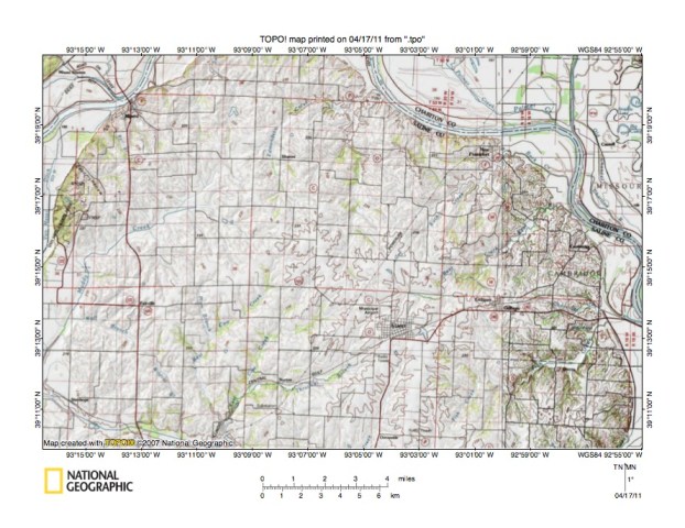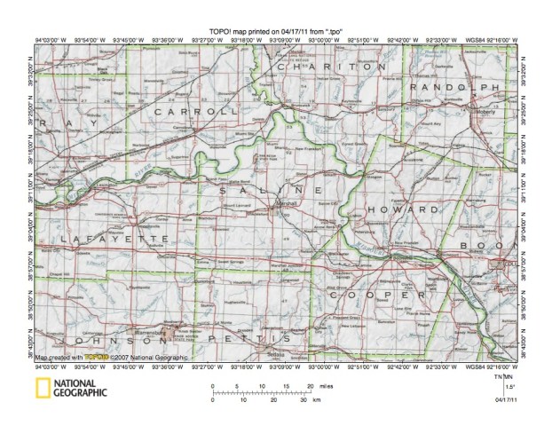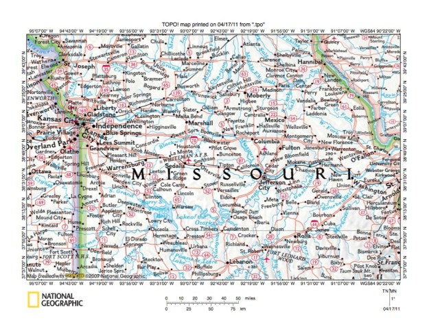 Figure 1: Missouri River-Blackwater River drainage divide area location map (select and click on maps to enlarge). National Geographic Society map digitally presented using National Geographic Society TOPO software.
