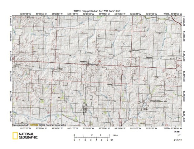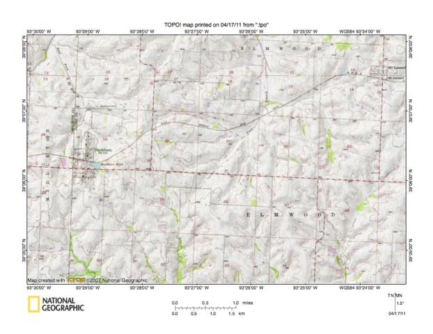 Figure 5: Salt Fork-Blackwater River drainage divide area. United States Geological Survey map digitally presented using National Geographic Society TOPO software.