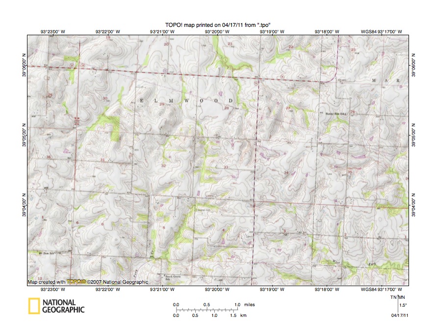 Figure 2: Detailed location map for Missouri River-Blackwater River drainage divide area. United States Geological Survey map digitally presented using National Geographic Society TOPO software.