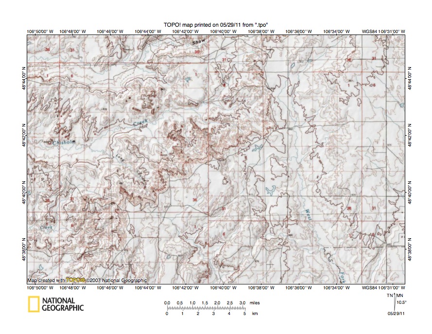 - Figure 6 illustrates the Chisholm Creek-West Fork Porcupine Creek drainage divide area located south and slightly west of the figure 4 map area and including overlap areas with figure 4. Chisholm Creek flows in a west-southwest and west direction to the figure 6 west center edge. North of Chisholm Creek in the figure 6 northwest quadrant Willow Creek (unlabeled) flows in a southwest and west direction to the figure 6 west edge (just south of northwest corner). Shaw Coulee joins Willow Creek near the figure 6 north edge. West of figure 6 Willow Creek turns to flow in a south-southwest direction to join south-oriented Rock Creek. Just north of the figure 6 southwest corner south-southwest and west oriented headwaters of Drifter Creek (only the word Creek is visible) flow to Willow Creek, which then joins Rock Creek. Note how the Drifter Creek headwaters valley is linked by a through valley with the Chisholm Creek valley. The south-southeast oriented stream in the figure 6 east half flowing from the northeast quadrant to the south edge is the West Fork Porcupine Creek. As previously described the south-southeast oriented West Fork Porcupine Creek valley is linked by a through valley with the Chisholm Creek and the Shaw Coulee valleys. The through valley floor elevation at the drainage divide are between 890 and 900 meters and elevations greater than 950 meters are found on both sides of the through valley. Further east is an unlabeled southeast-oriented stream flowing to the figure 6 south center edge. This stream is Buggy Creek (which will be seen again in figure 8) and south of the figure 8 map area Buggy Creek turns to flow in a south-southwest direction, although a southeast-oriented through valley links the southeast-oriented Buggy Creek valley segment with the southeast-oriented Dry Fork Porcupine Creek valley (this will be seen in figure 8). Note in figure 6 how the southeast-oriented Buggy Creek headwaters valley is linked by a through valley with the northwest-oriented Long Coulee valley, which drains to Chisholm Creek. The through valley floor elevation appears to be between 910 and 920 meters (probably closer to 920 meters) and elevations greater than 950 meters can be found on either side of the through valley. This through valley is further evidence headward erosion of deep south-southwest oriented valleys from the newly eroded Milk River valley captured multiple southeast and south-southeast oriented flood flow channels moving flood waters to the actively eroding Porcupine Creek valley system, such as might be found in a large southeast and south-southeast oriented anastomosing channel complex. The northwest-oriented Long Coulee valley was eroded by a reversal of flood flow on the northwest end of the southeast-oriented flood flow channel, which was beheaded by headward erosion of the deep Chisholm Creek valley.