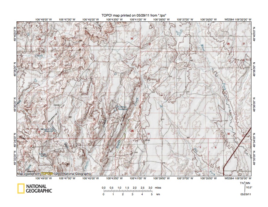 - Figure 7 provides a detailed topographic map of the Chisholm Creek-West Fork Porcupine Creek drainage divide area seen in less detail in figure 6 above. West Fork Porcupine Creek is labeled and flows in a south-southeast and south direction in the figure 7 east half. Chisholm Creek flows in a southwest and west direction across the figure 7 northwest corner. Note how Chisholm Creek has a west-northwest oriented tributary in section 5 near the figure 7 north edge and a northwest-oriented tributary in sections 7 and 8, which also flows across the section 17 northeast corner. In the southwest quadrant of section 4 (near figure 7 north edge) a through valley links the west-northwest oriented Chisholm Creek tributary valley with the south-southeast oriented West Fork Porcupine Creek valley. Further south in the north half of section 16 another through valley links the northwest-oriented Chisholm Creek tributary valley with the south-oriented West Fork Porcupine Creek valley. The map contour interval is 10 feet with some dotted 5-foot contour lines and floors of both through valleys at the drainage divides are between 2940 and 2950 feet in elevation. Between the two through valleys is a hill which rises to 3002 feet in elevation. But, notice that elevations rise to 3150 feet in the figure 7 northeast corner and a spot elevation of 3134 feet is located in section 19 near the figure 7 southwest corner. These high elevations define a much broader and deeper through valley than the through valleys in sections 4 and 16 first appear to be. The broader and deeper through valley spans the diagonal distance between the high elevations mentioned, which is approximately 4.5 miles, and is approximately 200 feet deep at its deepest points. This large south-southeast oriented through valley is a remnant of what was once a major south-southeast oriented flood flow channel, which was just one of several large south-southeast oriented flood flow channels crossing what is today the Rock Creek-Porcupine Creek drainage divide area. Headward erosion of the deep south-southwest oriented Rock Creek valley and its southwest and west-oriented tributary valleys, such as the Chisholm Creek valley, systematically captured the south-southeast oriented flood flow and diverted the water to what was then the newly eroded Milk River valley.